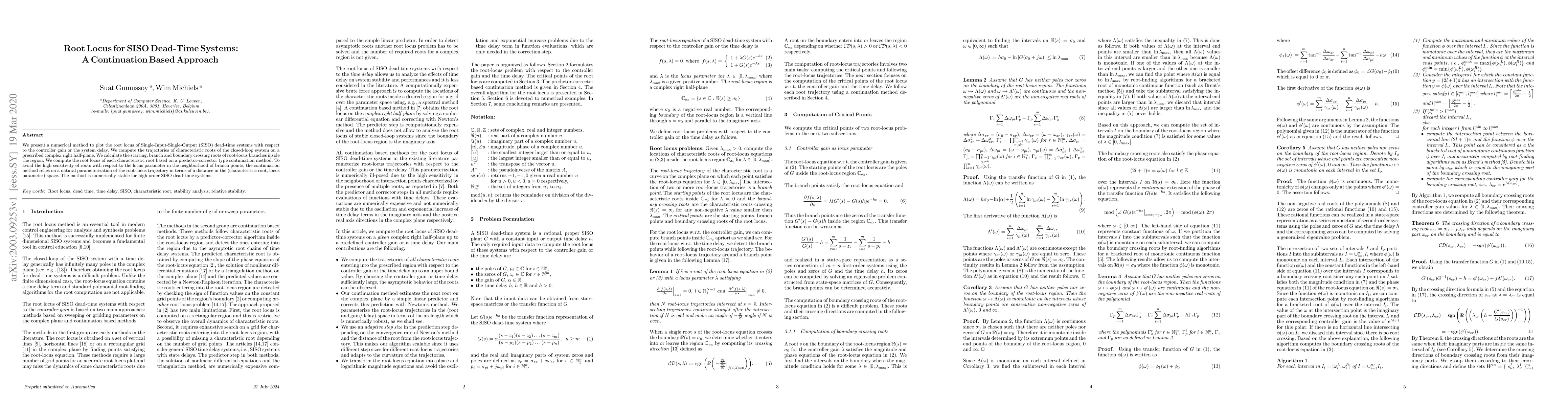 We present a numerical method to plot the root locus of Single-Input-Single-Output (SISO) dead-time systems with respect to the controller gain or the system delay. We compute the trajectories of characteristic roots of the closed-loop system on a prescribed complex right half-plane. We calculate the starting, branch and boundary crossing roots of root-locus branches inside the region. We compute the root locus of each characteristic root based on a predictor-corrector type continuation method. To avoid the high sensitivity of roots with respect to the locus parameter in the neighborhood of branch points, the continuation method relies on a natural parameterization of the root-locus trajectory in terms of a distance in the (characteristic root, locus parameter)-space. The method is numerically stable for high order SISO dead-time systems.