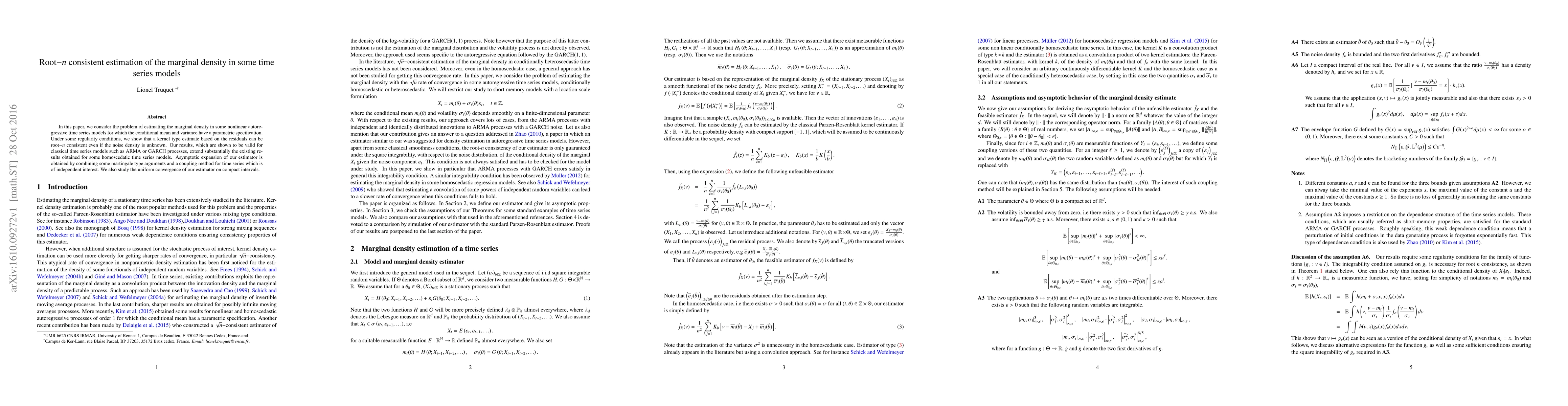 A new method for estimating marginal density in nonlinear time series models is presented, showing it can be root-n consistent even with unknown noise density, extending existing results to classical models like ARMA or GARCH.