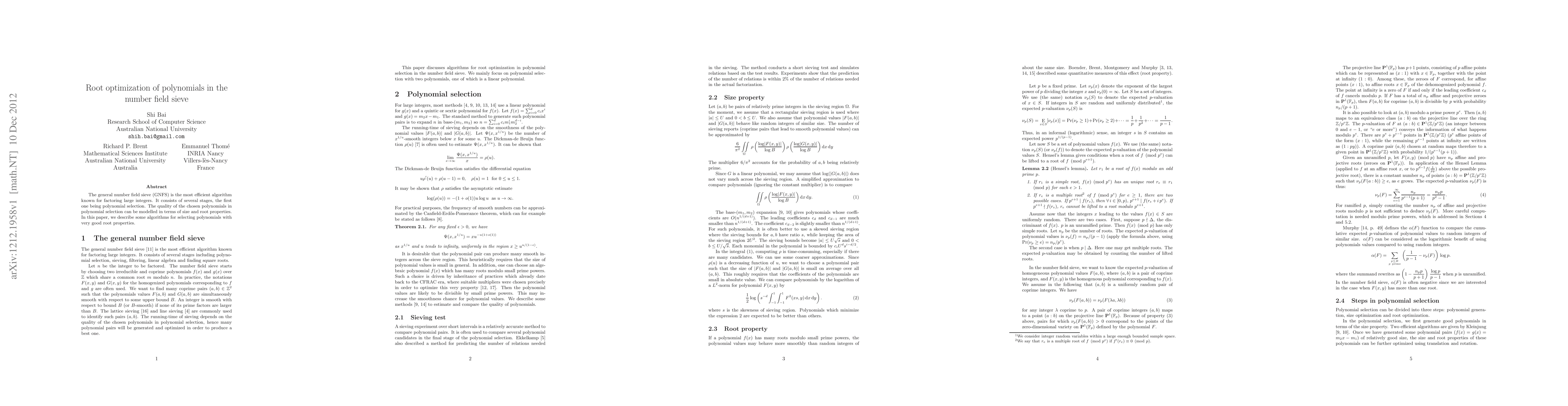 This paper presents algorithms to optimize the selection of polynomials in the general number field sieve (GNFS) for factoring large integers, focusing on improving root properties to enhance the efficiency of the algorithm.