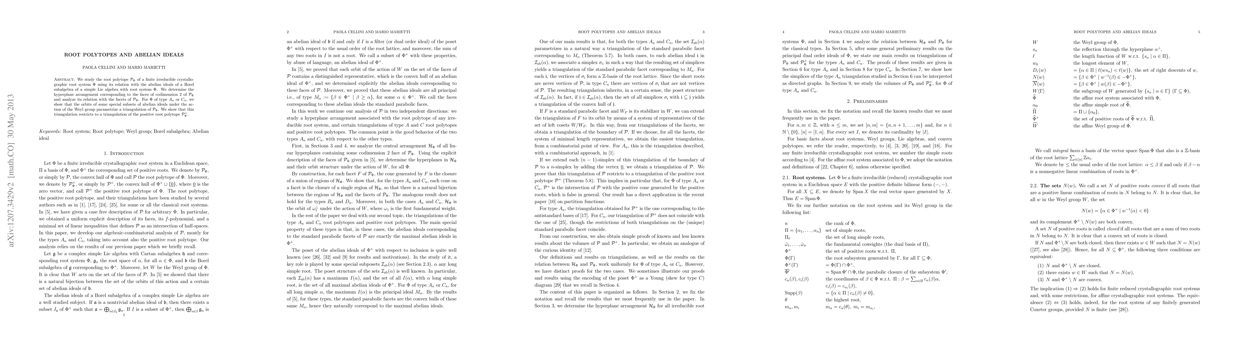 We study the root polytope $\mathcal P_\Phi$ of a finite irreducible crystallographic root system $\Phi$ using its relation with the abelian ideals of a Borel subalgebra of a simple Lie algebra with root system $\Phi$. We determine the hyperplane arrangement corresponding to the faces of codimension 2 of $\mathcal P_\Phi$ and analyze its relation with the facets of $\mathcal P_\Phi$. For $\Phi$ of type $A_n$ or $C_n$, we show that the orbits of some special subsets of abelian ideals under the action of the Weyl group parametrize a triangulation of $\mathcal P_\Phi$. We show that this triangulation restricts to a triangulation of the positive root polytope $\mathcal P_\Phi^+$.