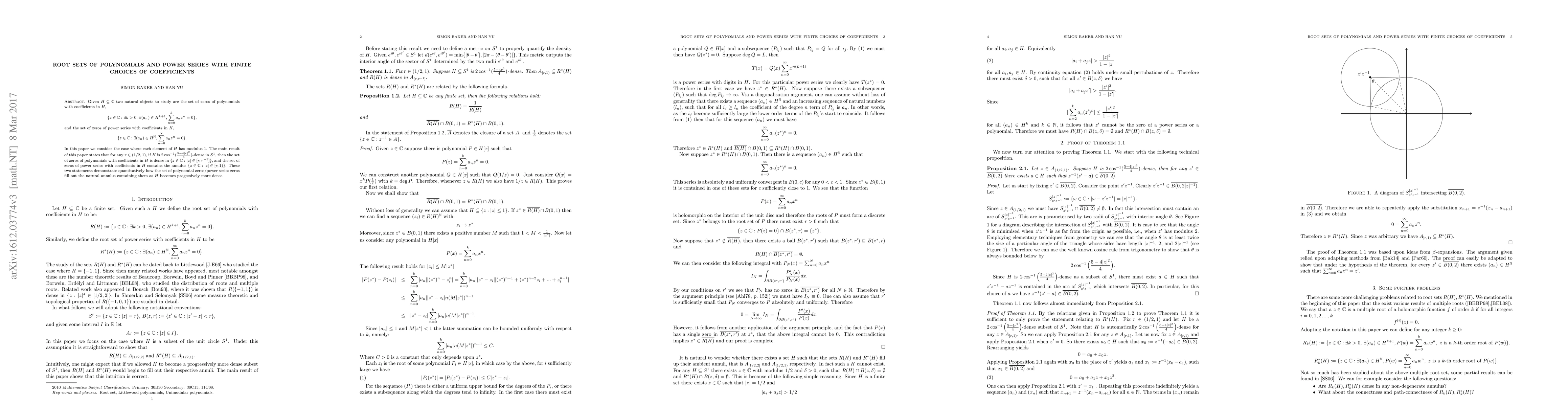 This paper investigates the root sets of polynomials and power series with coefficients constrained to a set $H$ on the unit circle. It demonstrates that when $H$ is sufficiently dense, the zeros of polynomials and power series with coefficients in $H$ densely fill an annulus centered around the origin.
