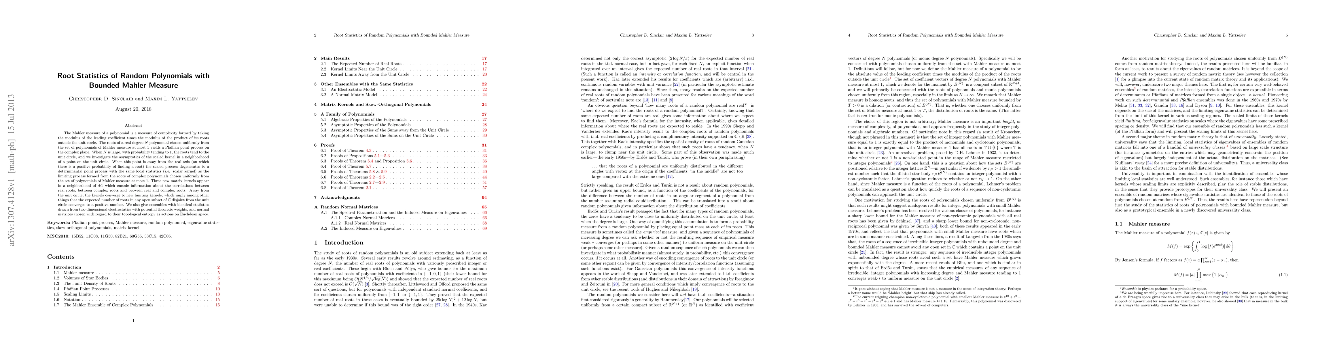 This paper explores the root statistics of random polynomials with bounded Mahler measure, showing that their roots tend to the unit circle as degree increases. It introduces new matrix kernels near ±1 that capture correlations between real and complex roots, and provides ensembles with matching statistics derived from electrostatics and normal matrices.