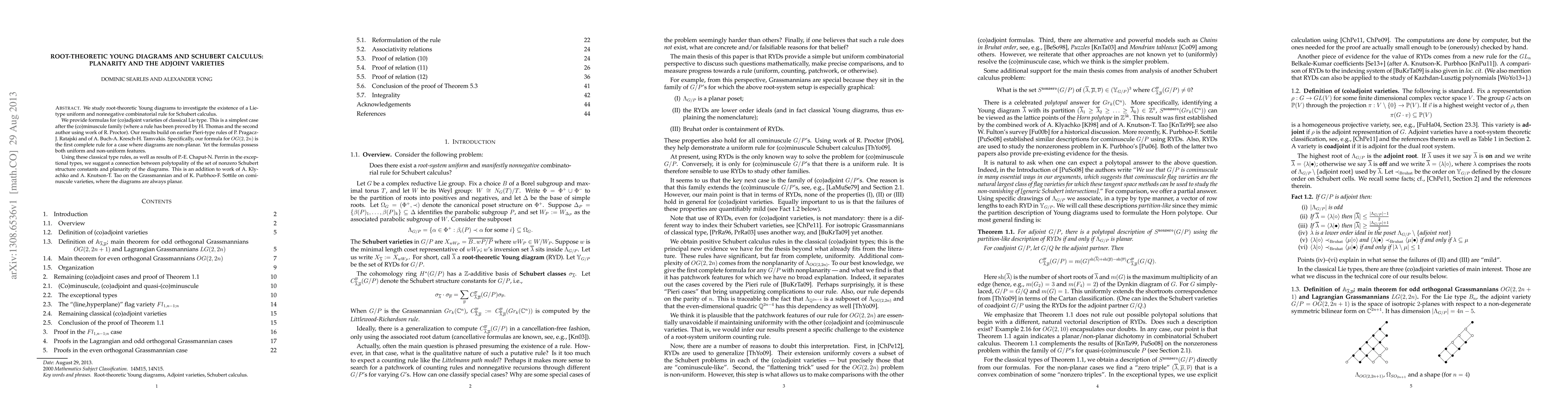 We study root-theoretic Young diagrams to investigate the existence of a Lie-type uniform and nonnegative combinatorial rule for Schubert calculus. We provide formulas for (co)adjoint varieties of classical Lie type. This is a simplest case after the (co)minuscule family (where a rule has been proved by H.Thomas and the second author using work of R.Proctor). Our results build on earlier Pieri-type rules of P.Pragacz-J.Ratajski and of A.Buch-A.Kresch-H.Tamvakis. Specifically, our formula for OG(2,2n) is the first complete rule for a case where diagrams are non-planar. Yet the formulas possess both uniform and non-uniform features. Using these classical type rules, as well as results of P.-E.Chaput-N.Perrin in the exceptional types, we suggest a connection between polytopality of the set of nonzero Schubert structure constants and planarity of the diagrams. This is an addition to work of A.Klyachko and A.Knutson-T.Tao on the Grassmannian and of K.Purbhoo-F.Sottile on cominuscule varieties, where the diagrams are always planar.