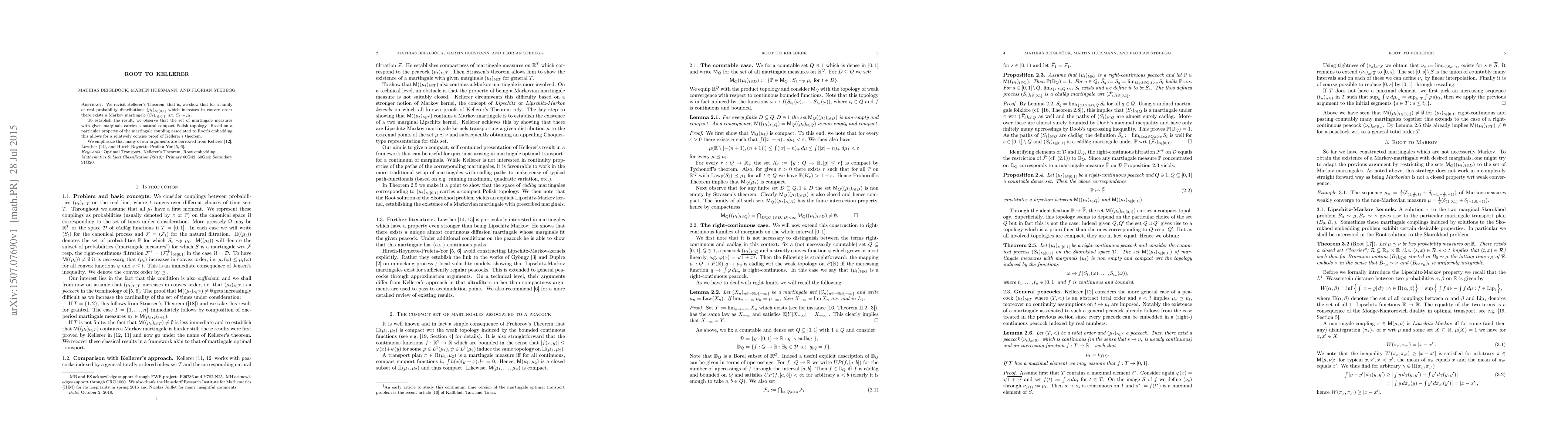 We revisit Kellerer's Theorem, that is, we show that for a family of real probability distributions $(\mu_t)_{t\in [0,1]}$ which increases in convex order there exists a Markov martingale $(S_t)_{t\in[0,1]}$ s.t.\ $S_t\sim \mu_t$. To establish the result, we observe that the set of martingale measures with given marginals carries a natural compact Polish topology. Based on a particular property of the martingale coupling associated to Root's embedding this allows for a relatively concise proof of Kellerer's theorem. We emphasize that many of our arguments are borrowed from Kellerer \cite{Ke72}, Lowther \cite{Lo07}, and Hirsch-Roynette-Profeta-Yor \cite{HiPr11,HiRo12}.