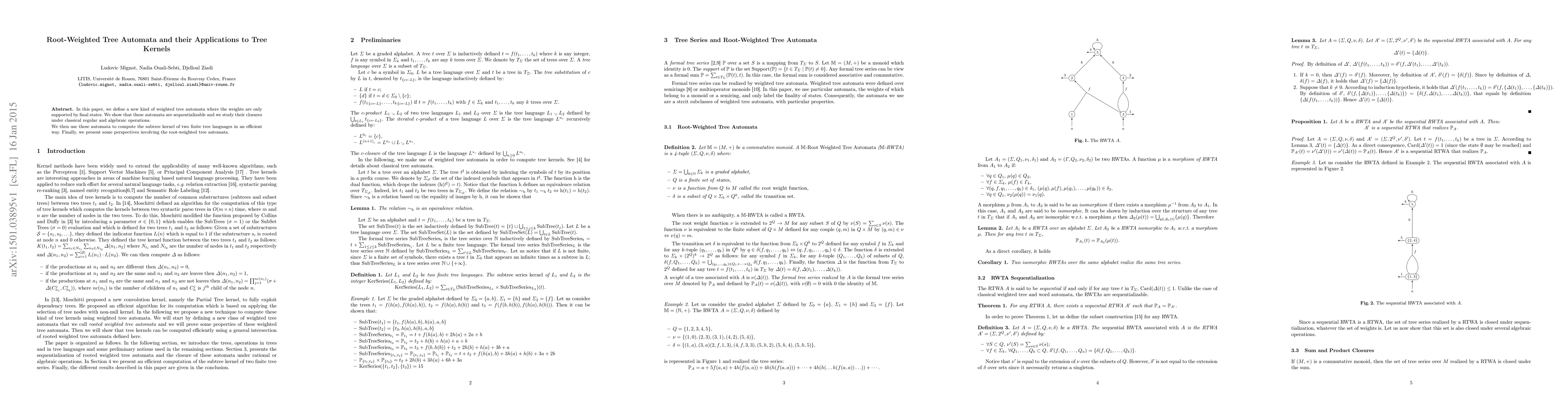 This paper introduces root-weighted tree automata with weights on final states, proving their sequentializability and closure properties. It leverages these automata to efficiently compute subtree kernels for finite tree languages.