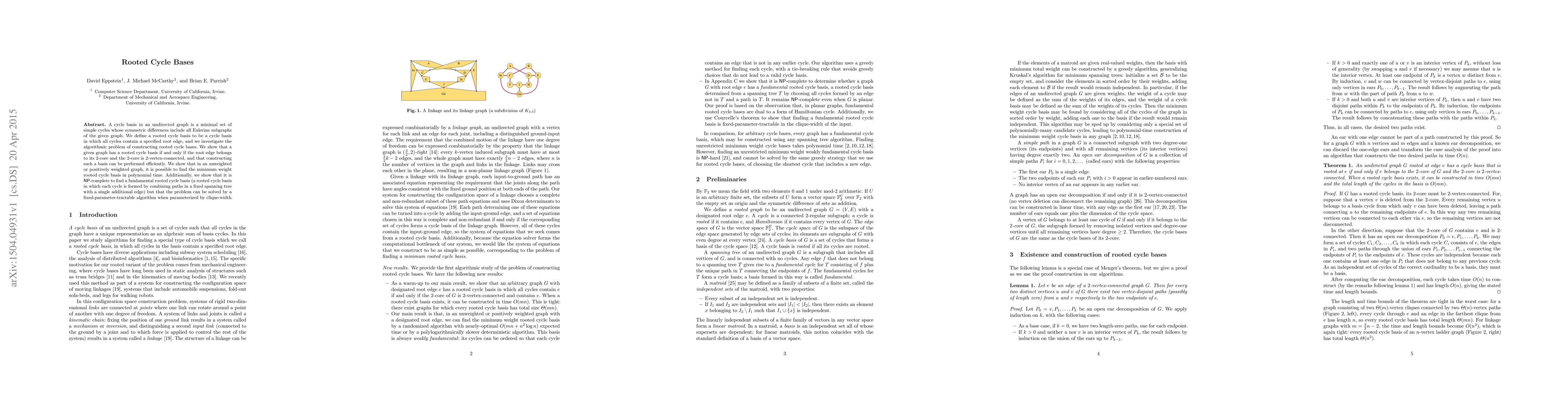 A graph has a rooted cycle basis if its 2-core is 2-vertex-connected; efficient construction methods exist for unweighted or positively weighted graphs.