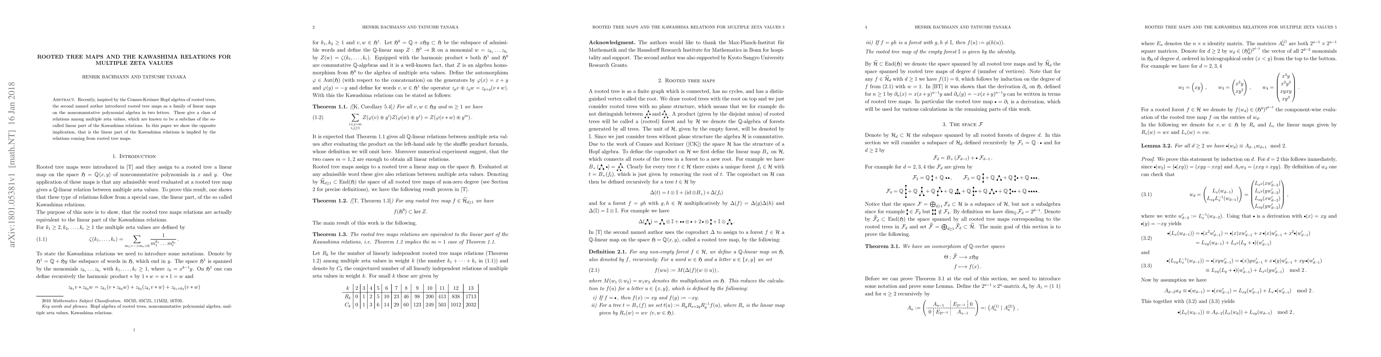 Recently, inspired by the Connes-Kreimer Hopf algebra of rooted trees, the second named author introduced rooted tree maps as a family of linear maps on the noncommutative polynomial algebra in two letters. These give a class of relations among multiple zeta values, which are known to be a subclass of the so-called linear part of the Kawashima relations. In this paper we show the opposite implication, that is the linear part of the Kawashima relations is implied by the relations coming from rooted tree maps.