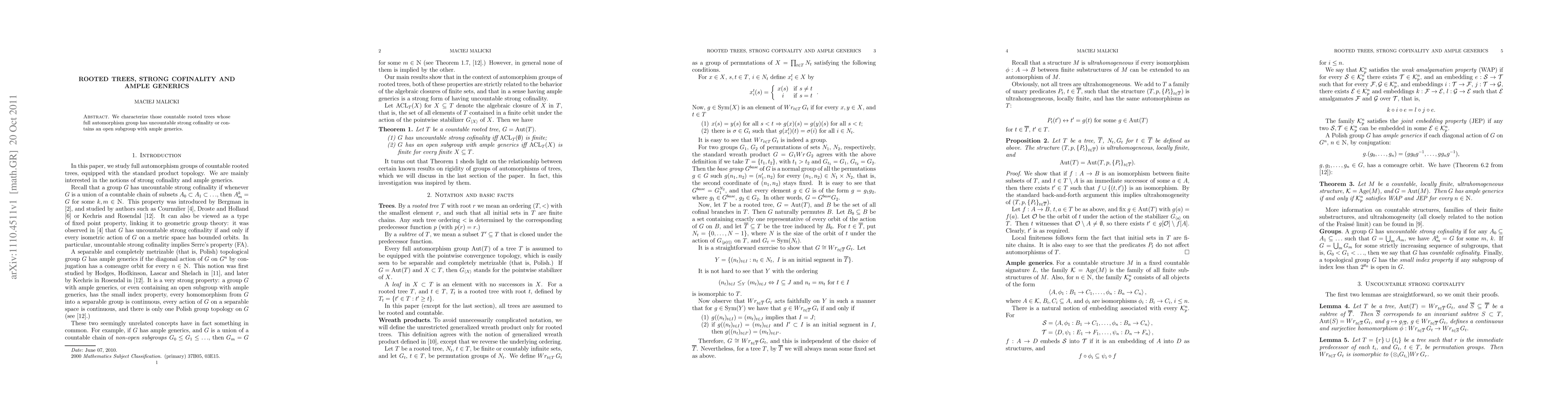 This paper investigates countable rooted trees with uncountable strong cofinality or open subgroups containing ample generics, providing new insights into their automorphism groups.