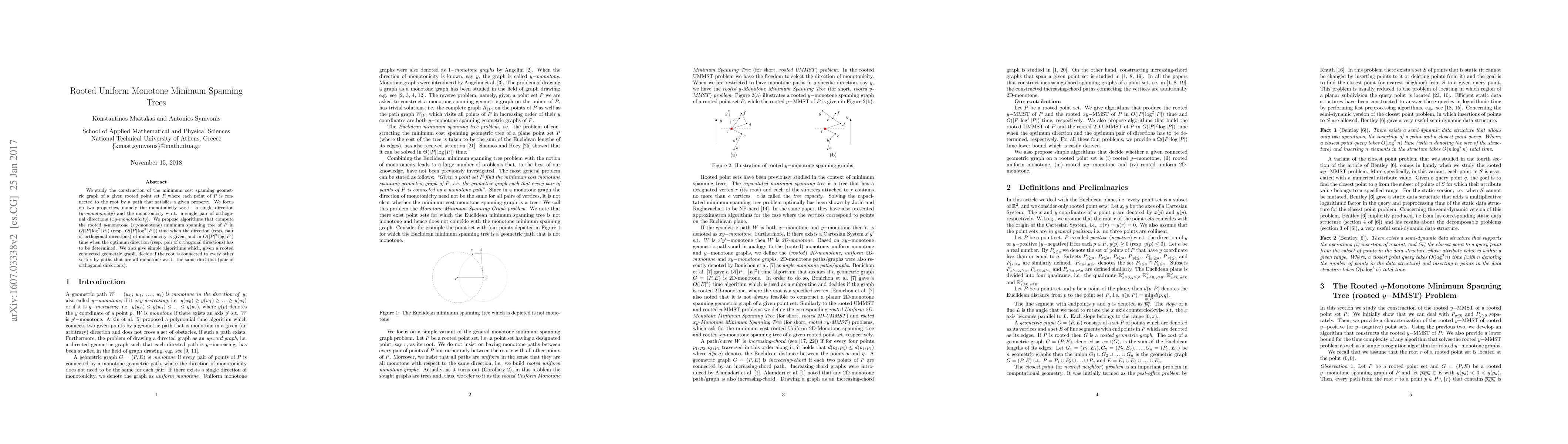 We study the construction of the minimum cost spanning geometric graph of a given rooted point set $P$ where each point of $P$ is connected to the root by a path that satisfies a given property. We focus on two properties, namely the monotonicity w.r.t. a single direction ($y$-monotonicity) and the monotonicity w.r.t. a single pair of orthogonal directions ($xy$-monotonicity). We propose algorithms that compute the rooted $y$-monotone ($xy$-monotone) minimum spanning tree of $P$ in $O(|P|\log^2 |P|)$ (resp. $O(|P|\log^3 |P|)$) time when the direction (resp. pair of orthogonal directions) of monotonicity is given, and in $O(|P|^2\log|P|)$ time when the optimum direction (resp. pair of orthogonal directions) has to be determined. We also give simple algorithms which, given a rooted connected geometric graph, decide if the root is connected to every other vertex by paths that are all monotone w.r.t. the same direction (pair of orthogonal directions).
