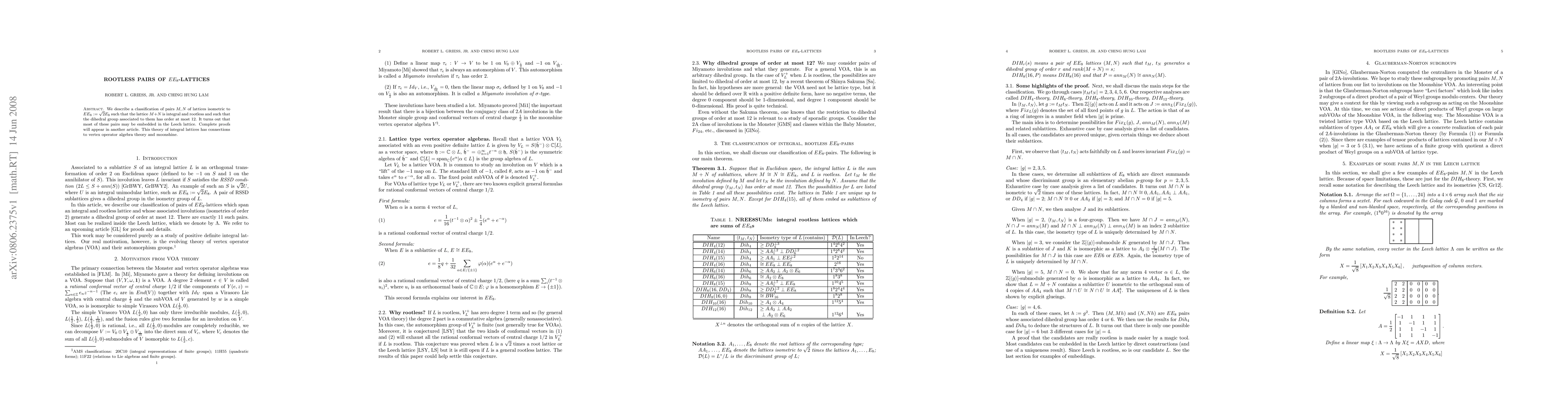 We describe a classification of pairs $M, N$ of lattices isometric to $EE_8:=\sqrt 2 E_8$ such that the lattice $M + N$ is integral and rootless and such that the dihedral group associated to them has order at most 12. It turns out that most of these pairs may be embedded in the Leech lattice. Complete proofs will appear in another article. This theory of integral lattices has connections to vertex operator algebra theory and moonshine.