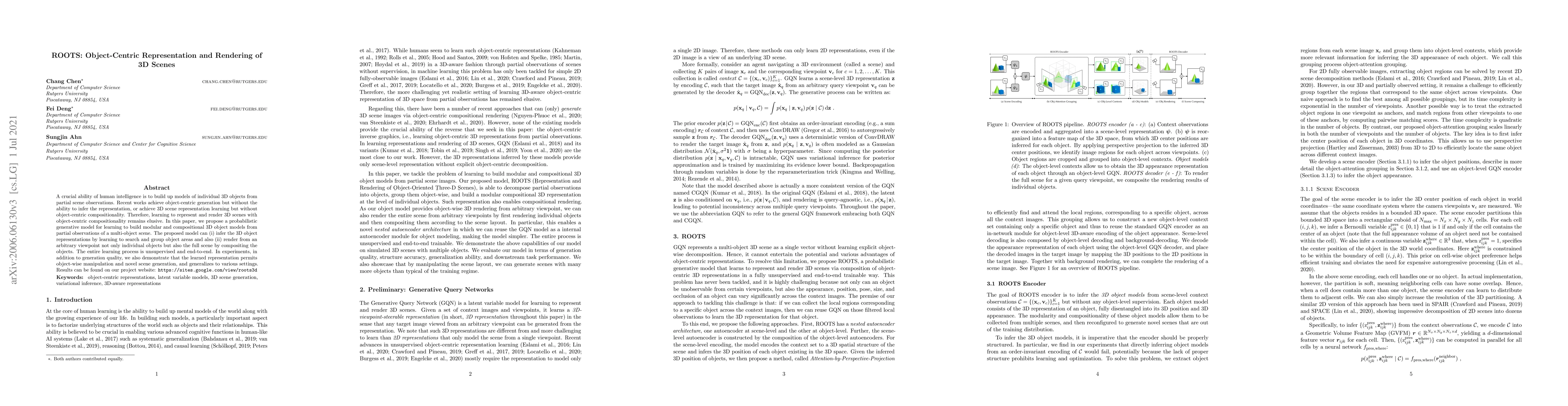 A crucial ability of human intelligence is to build up models of individual 3D objects from partial scene observations. Recent works achieve object-centric generation but without the ability to infer the representation, or achieve 3D scene representation learning but without object-centric compositionality. Therefore, learning to represent and render 3D scenes with object-centric compositionality remains elusive. In this paper, we propose a probabilistic generative model for learning to build modular and compositional 3D object models from partial observations of a multi-object scene. The proposed model can (i) infer the 3D object representations by learning to search and group object areas and also (ii) render from an arbitrary viewpoint not only individual objects but also the full scene by compositing the objects. The entire learning process is unsupervised and end-to-end. In experiments, in addition to generation quality, we also demonstrate that the learned representation permits object-wise manipulation and novel scene generation, and generalizes to various settings. Results can be found on our project website: https://sites.google.com/view/roots3d