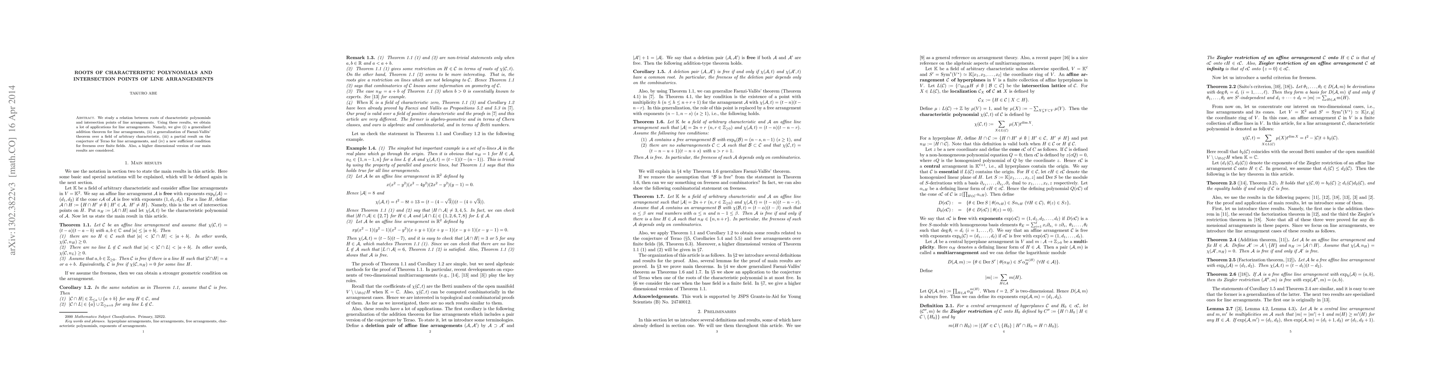 This paper establishes a connection between the roots of characteristic polynomials and intersection points of line arrangements, leading to new results on addition theorems, conjectures, and conditions for freeness over finite fields.