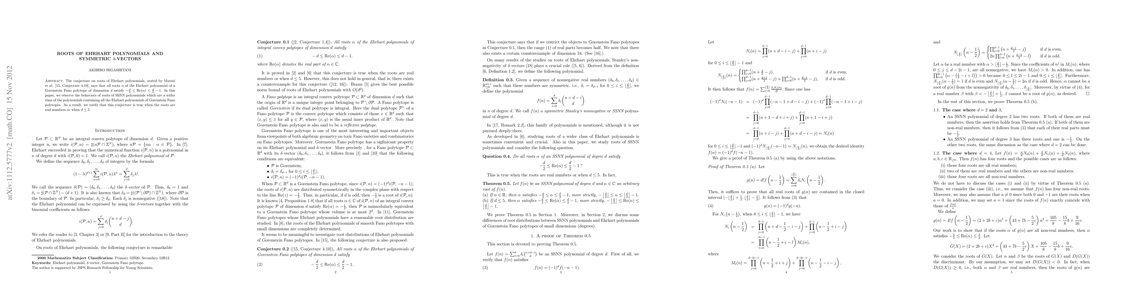 This paper verifies Matsui et al.'s conjecture on the roots of Ehrhart polynomials for Gorenstein Fano polytopes, confirming that all roots lie within the range $-\frac{d}{2} \leq \Re(\alpha) \leq \frac{d}{2} -1$ for real roots and when the dimension $d \leq 5$. The study extends to SSNN polynomials, a broader class encompassing Ehrhart polynomials.