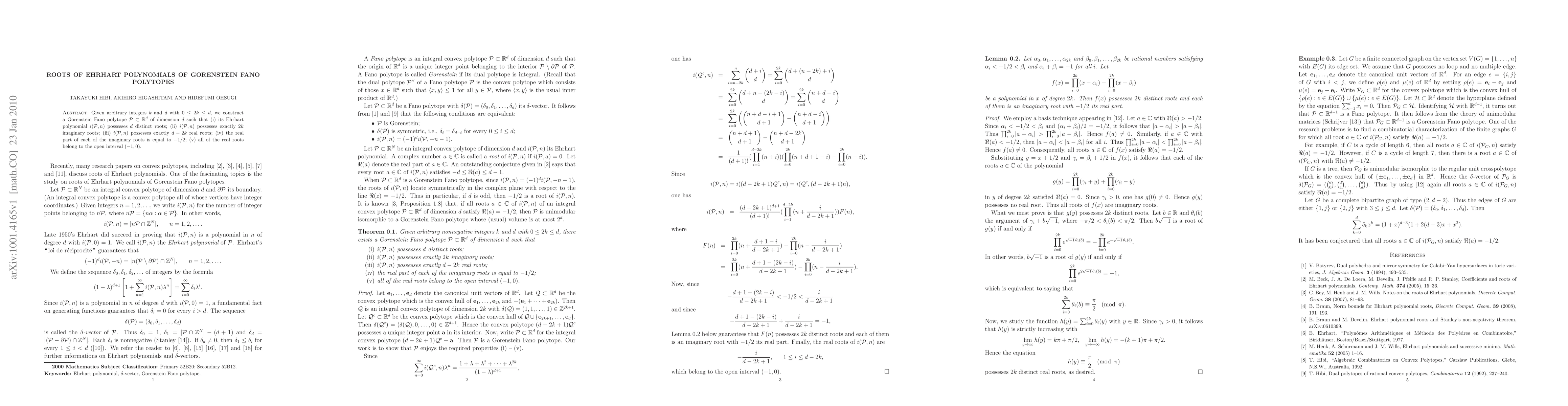 This paper presents a method to construct Gorenstein Fano polytopes in RR^d with specific Ehrhart polynomial properties. These polytopes have d distinct roots, 2k imaginary roots with real part -1/2, and d-2k real roots in the interval (-1, 0), given integers k and d where 0 ≤ 2k ≤ d.