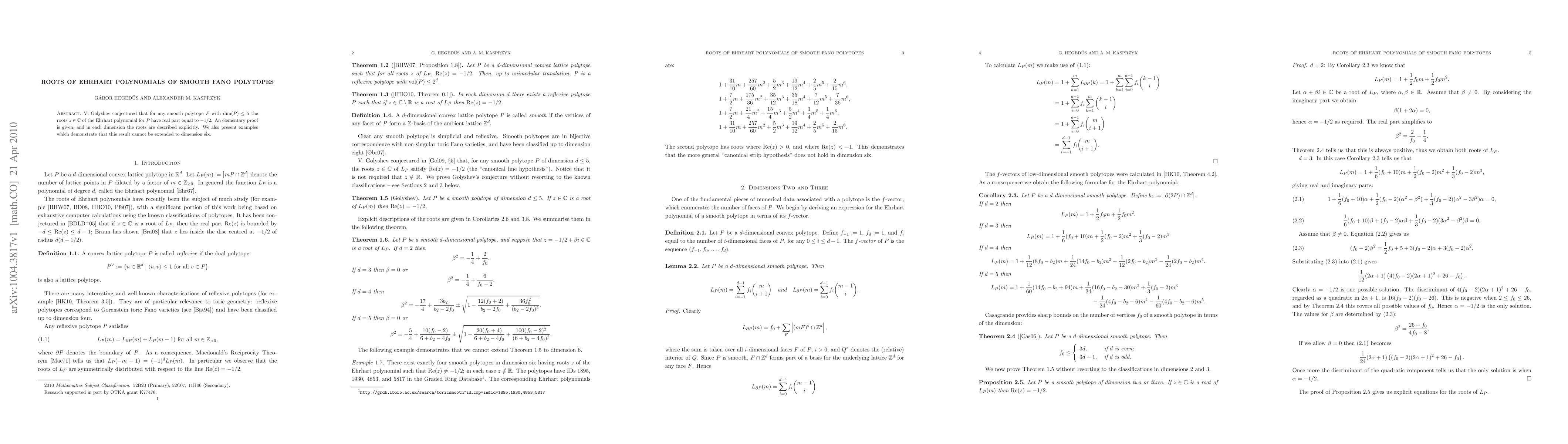 V. Golyshev conjectured that for any smooth polytope P of dimension at most five, the roots $z\in\C$ of the Ehrhart polynomial for P have real part equal to -1/2. An elementary proof is given, and in each dimension the roots are described explicitly. We also present examples which demonstrate that this result cannot be extended to dimension six.