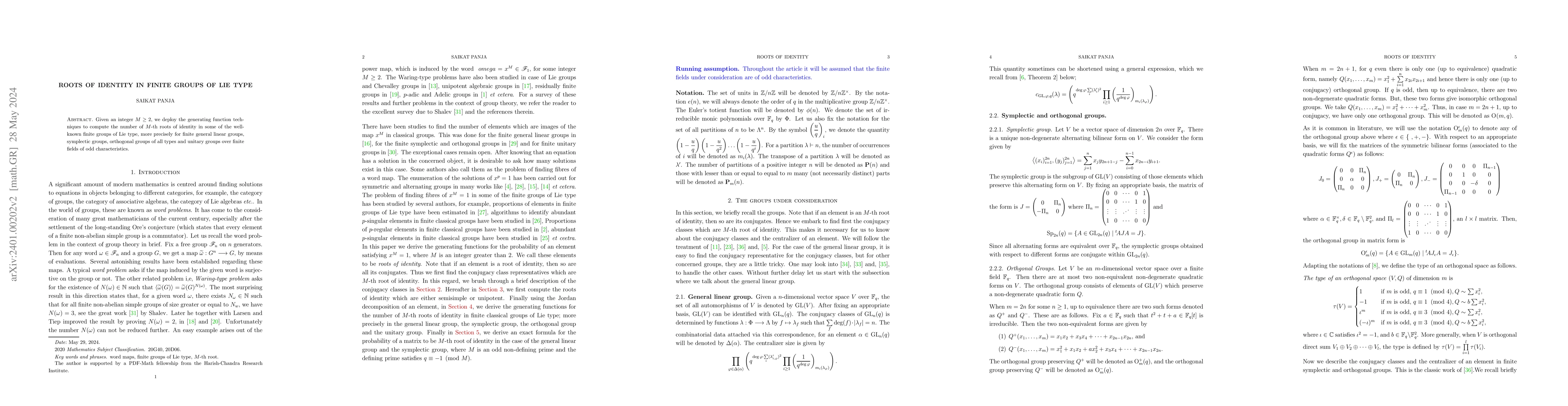 This research uses generating function techniques to determine the count of $M$-th roots of identity in various finite groups of Lie type, including general linear, symplectic, orthogonal, and unitary groups over finite fields with odd characteristics. The findings enhance understanding of the structural properties of these groups.