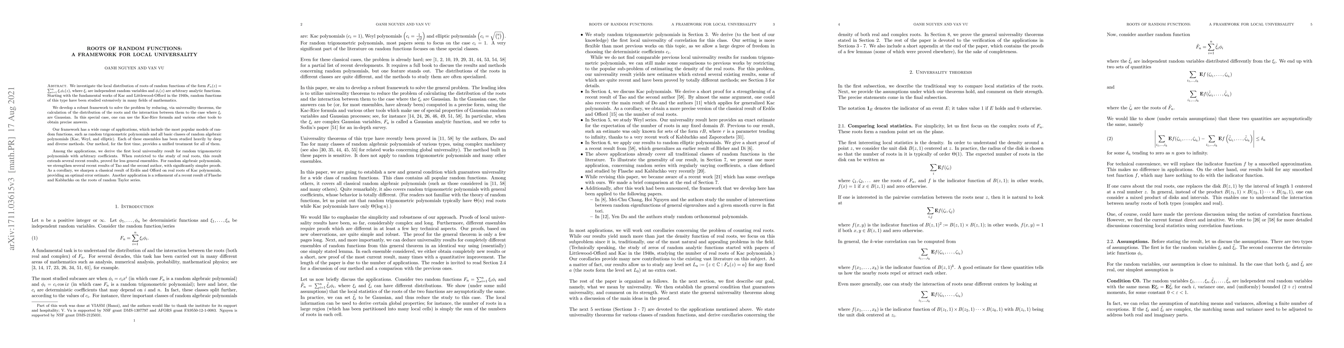 This paper develops a framework for understanding the local distribution of roots of random functions, reducing the problem to the Gaussian case for precise analysis. The approach provides unified treatment and local universality results for various ensembles, including random trigonometric polynomials and algebraic polynomials, with applications that strengthen existing results and offer new insights.