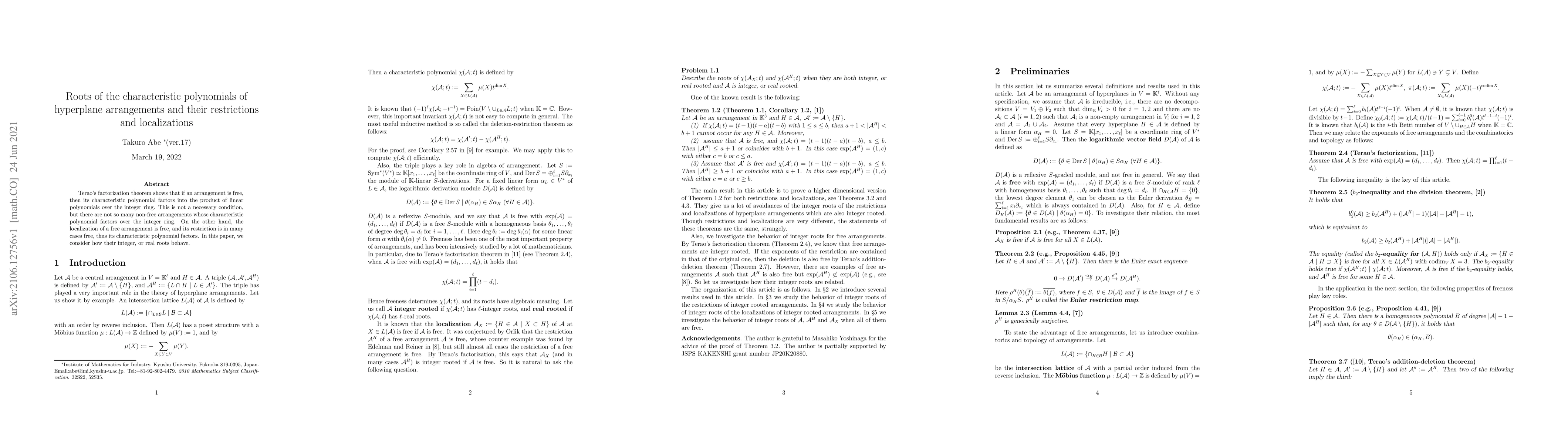 Terao's factorization theorem shows that if an arrangement is free, then its characteristic polynomial factors into the product of linear polynomials over the integer ring. This is not a necessary condition, but there are not so many non-free arrangements whose characteristic polynomial factors over the integer ring. On the other hand, the localization of a free arrangement is free, and its restriction is in many cases free, thus its characteristic polynomial factors. In this paper, we consider how their integer, or real roots behave.