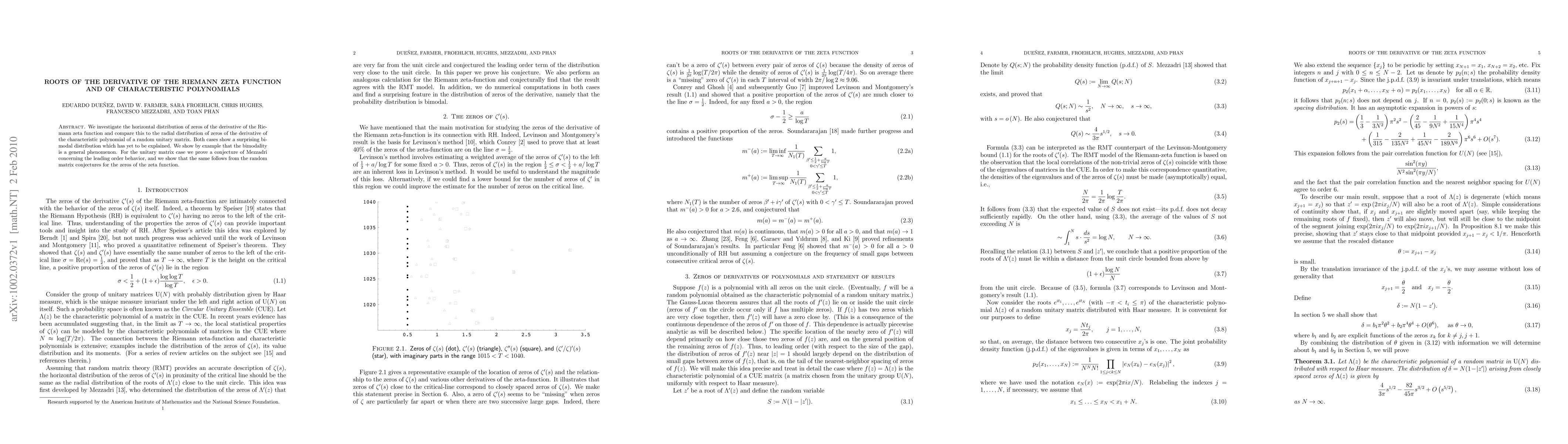This paper explores the horizontal distribution of zeros of the derivative of the Riemann zeta function and compares it to the radial distribution of zeros of the derivative of a random unitary matrix's characteristic polynomial, revealing a surprising bimodal distribution in both cases. The authors prove a conjecture for the unitary matrix case and suggest a connection to random matrix conjectures for the zeta function.