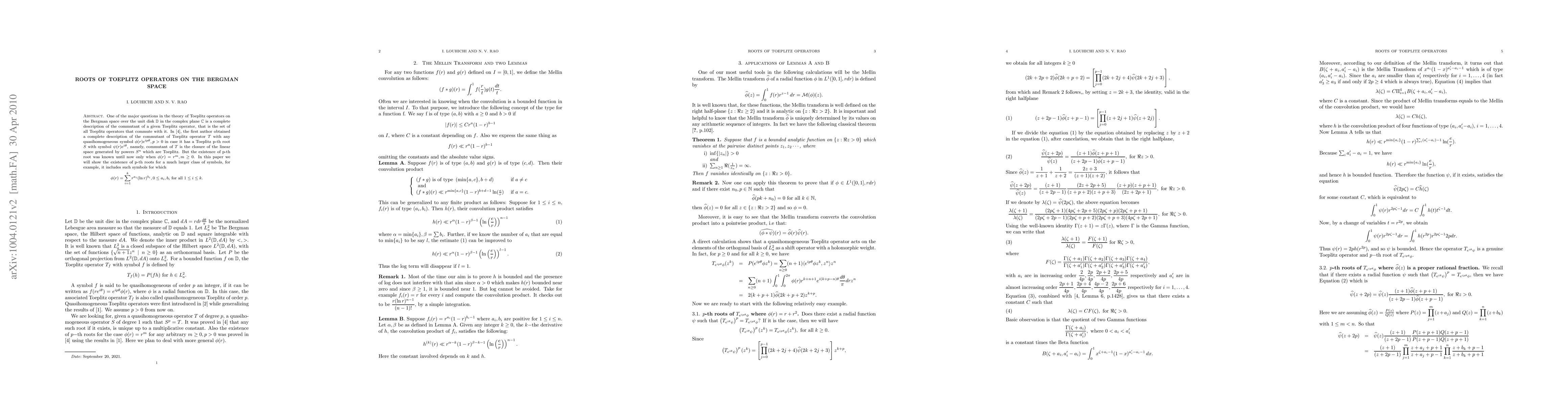 One of the major questions in the theory of Toeplitz operators on the Bergman space over the unit disk $\mathbb D$ in the complex plane $\mathbb C$ is a complete description of the commutant of a given Toeplitz operator, that is the set of all Toeplitz operators that commute with it. In \cite{l}, the first author obtained a complete description of the commutant of Toeplitz operator $T$ with any quasihomogeneous symbol $\phi(r)e^{ip\theta}, p>0$ in case it has a Toeplitz p-th root $S$ with symbol $\psi(r)e^{i\theta}$, namely, commutant of $T$ is the closure of the linear space generated by powers $S^n$ which are Toeplitz. But the existence of p-th root was known until now only when $\phi(r)=r^m,m \geq 0$. In this paper we will show the existence of p-th roots for a much larger class of symbols, for example, it includes such symbols for which $$\phi(r)=\sum_{i=1}^kr^{a_i}(\ln r)^{b_i},0\leq a_i, b_i for all 1\leq i\leq k .$$