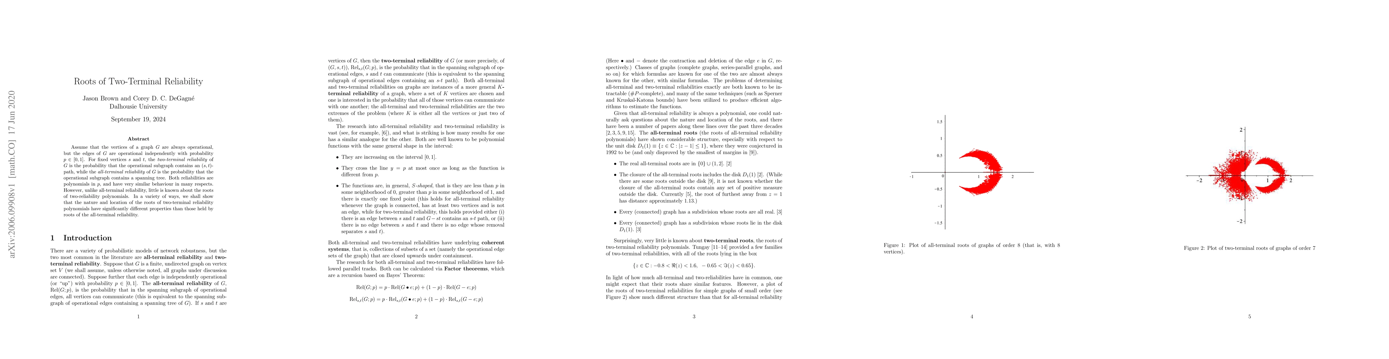 This paper investigates the properties of two-terminal reliability in graphs, focusing on the roots of the associated reliability polynomials. It contrasts the behavior and location of these roots with those of all-terminal reliability polynomials, revealing significant differences.