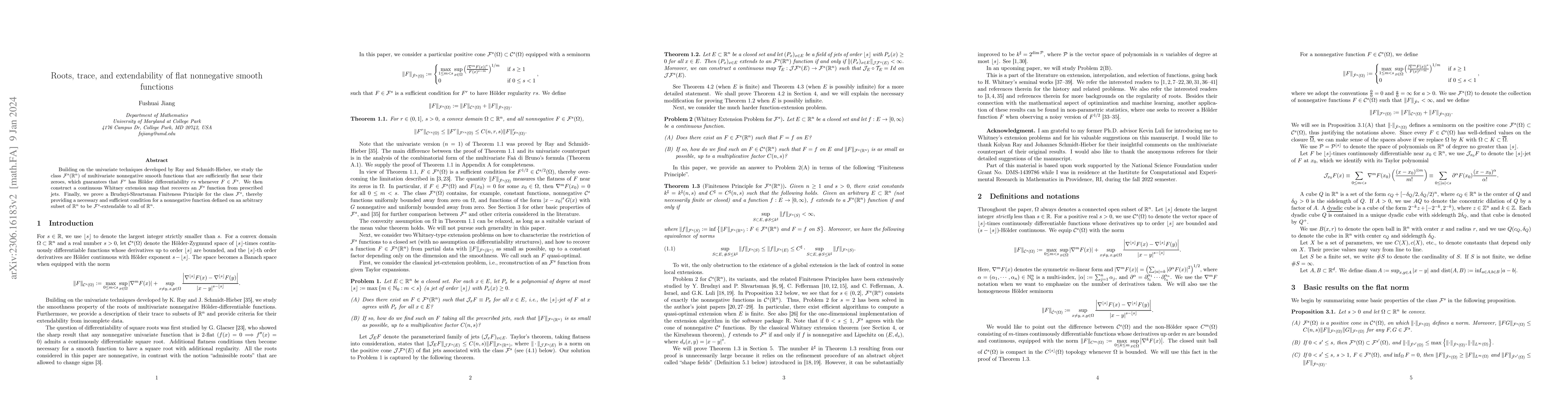 The paper builds upon univariate techniques by Ray and Schmidt-Hieber, focusing on multivariate nonnegative smooth functions that are sufficiently flat near their zeroes, ensuring Hölder differentiability of $\varphi^r$ when $\varphi \in \mathcal{F}^s$. It constructs a continuous Whitney extension map to recover an $\mathcal{F}^s$ function from prescribed jets and proves a Brudnyi-Shvartsman Finiteness Principle for the class $\mathcal{F}^s$, providing necessary and sufficient conditions for extendability of nonnegative functions defined on arbitrary subsets of $\mathbb{R}^n$ to all of $\mathbb{R}^n$.