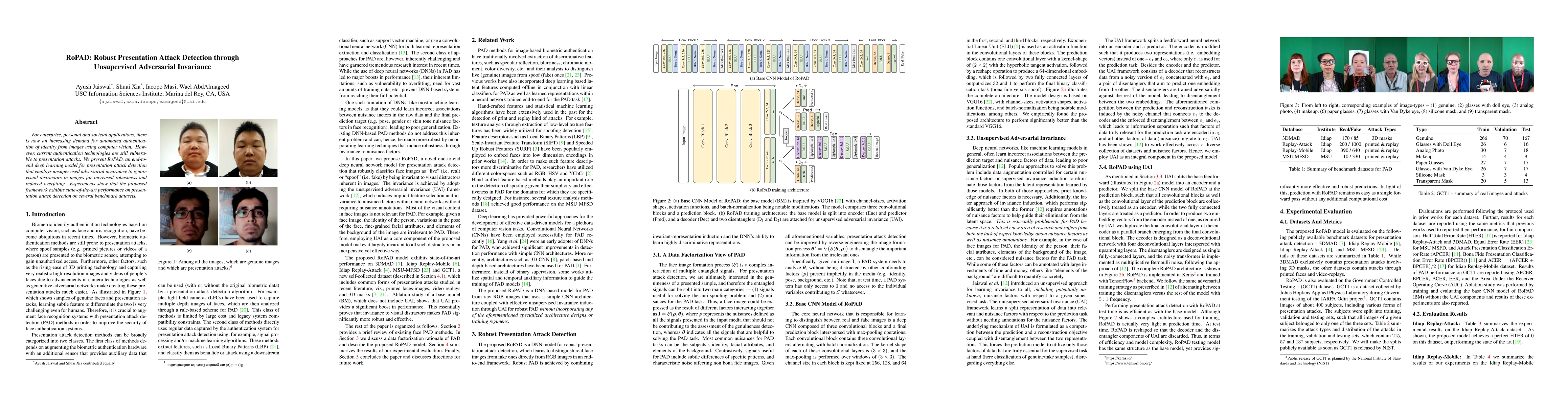 RoPAD is a deep learning model for presentation attack detection that uses unsupervised adversarial invariance to enhance robustness against visual distractors. It achieves state-of-the-art performance on several benchmark datasets, demonstrating its effectiveness in automated identity authentication.