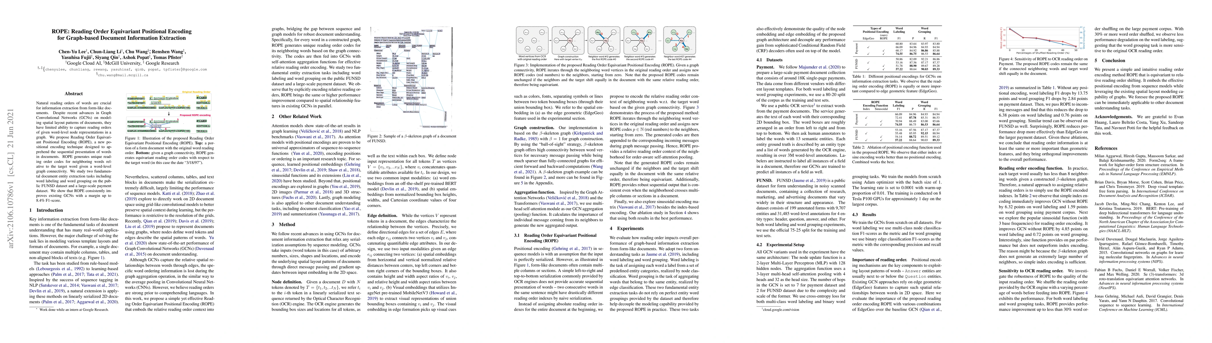 The paper introduces ROPE, a novel positional encoding technique to capture reading orders in graph-based document information extraction, enhancing the performance of Graph Convolutional Networks (GCNs) for tasks like word labeling and word grouping. ROPE generates unique codes for word sequences, achieving up to an 8.4% improvement in F1-score on FUNSD and payment datasets.
