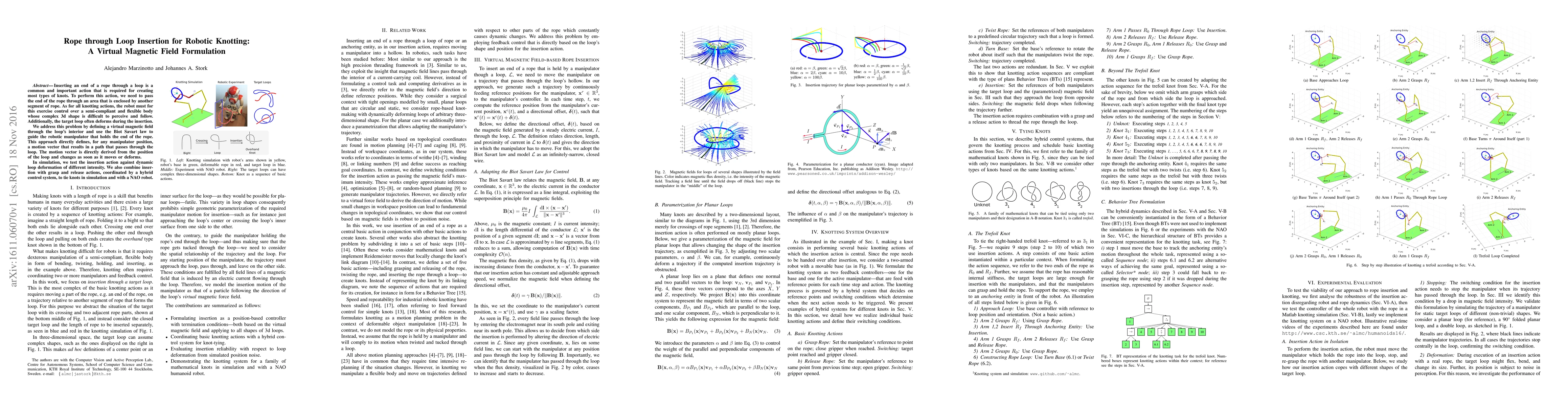 Inserting an end of a rope through a loop is a common and important action that is required for creating most types of knots. To perform this action, we need to pass the end of the rope through an area that is enclosed by another segment of rope. As for all knotting actions, the robot must for this exercise control over a semi-compliant and flexible body whose complex 3d shape is difficult to perceive and follow. Additionally, the target loop often deforms during the insertion. We address this problem by defining a virtual magnetic field through the loop's interior and use the Biot Savart law to guide the robotic manipulator that holds the end of the rope. This approach directly defines, for any manipulator position, a motion vector that results in a path that passes through the loop. The motion vector is directly derived from the position of the loop and changes as soon as it moves or deforms. In simulation, we test the insertion action against dynamic loop deformation of different intensity. We also combine insertion with grasp and release actions, coordinated by a hybrid control system, to tie knots in simulation and with a NAO robot.