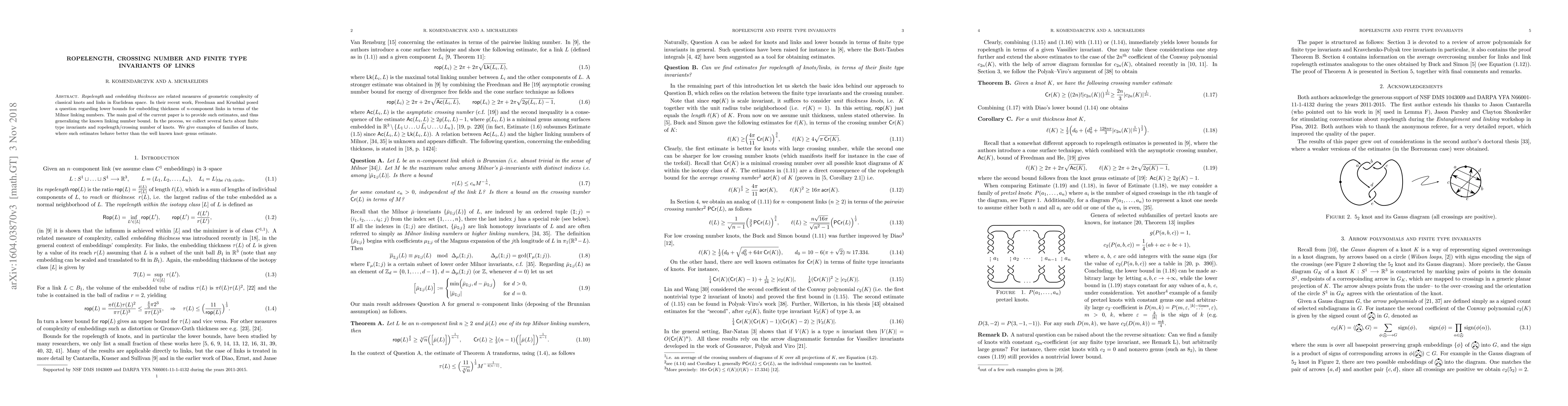 This paper provides estimates for the embedding thickness of $n$-component links in terms of their Milnor linking numbers, generalizing existing linking number bounds. It also explores finite type invariants and compares the ropelength and crossing number of knots to traditional knot-genus estimates.
