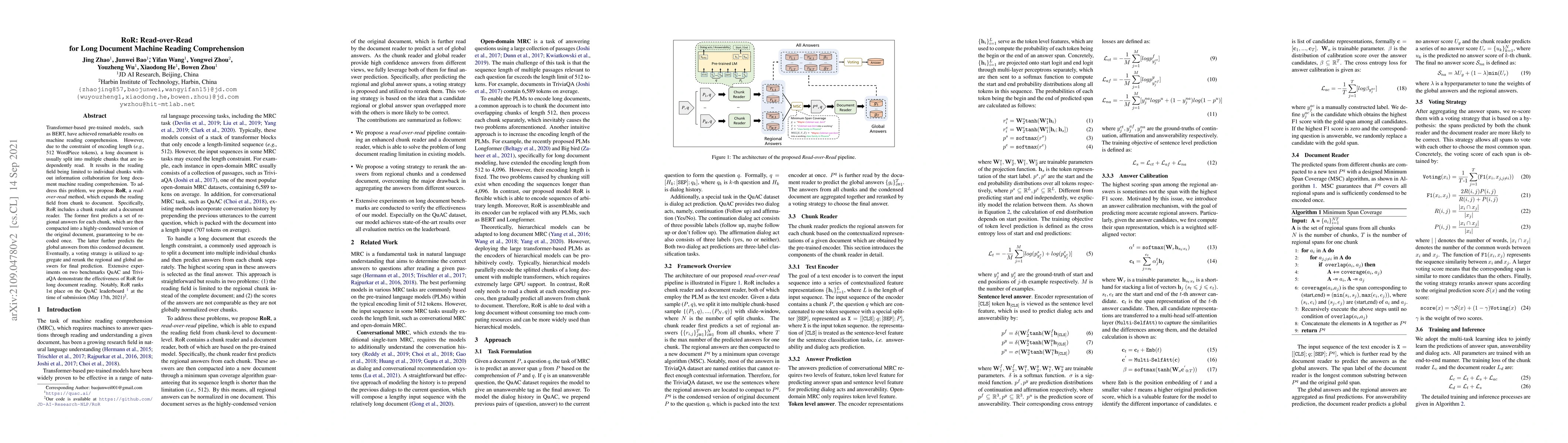 The paper proposes RoR, a read-over-read method to enhance machine reading comprehension for long documents, addressing the limitations of chunk-based reading in pre-trained models like BERT. RoR employs a chunk reader and a document reader to collaboratively predict answers, achieving top performance on QuAC and TriviaQA benchmarks.
