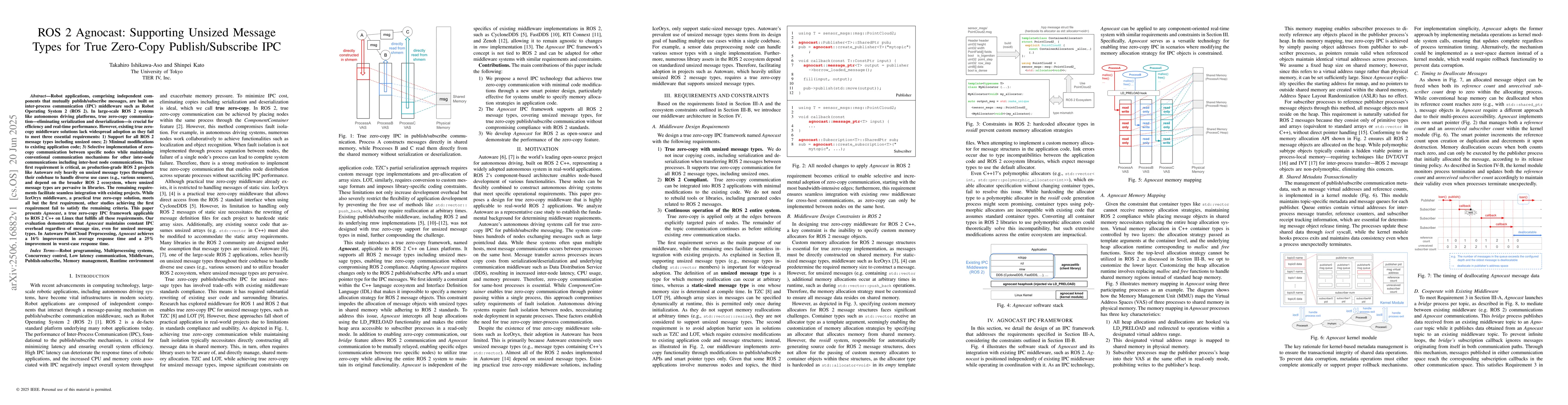 This paper introduces Agnocast, a true zero-copy IPC framework for ROS 2 C++ on Linux, addressing the need for supporting all message types, minimal code modifications, and selective zero-copy implementation. Evaluations show Agnocast maintains constant overhead for all message sizes, including unsized ones, improving Autoware PointCloud Preprocessing response times by 16% on average and 25% in worst-case scenarios.