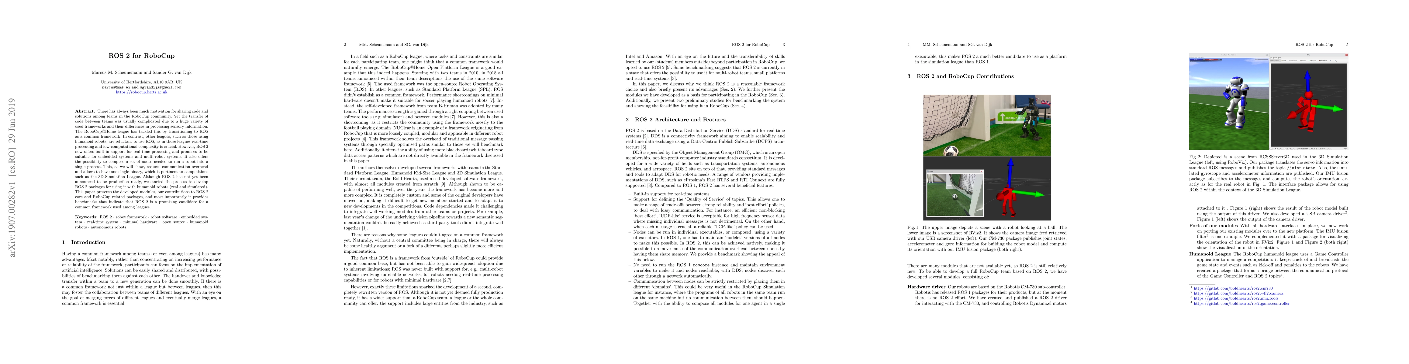 There has always been much motivation for sharing code and solutions among teams in the RoboCup community. Yet the transfer of code between teams was usually complicated due to a huge variety of used frameworks and their differences in processing sensory information. The RoboCup@Home league has tackled this by transitioning to ROS as a common framework. In contrast, other leagues, such as those using humanoid robots, are reluctant to use ROS, as in those leagues real-time processing and low-computational complexity is crucial. However, ROS 2 now offers built-in support for real-time processing and promises to be suitable for embedded systems and multi-robot systems. It also offers the possibility to compose a set of nodes needed to run a robot into a single process. This, as we will show, reduces communication overhead and allows to have one single binary, which is pertinent to competitions such as the 3D-Simulation League. Although ROS 2 has not yet been announced to be production ready, we started the process to develop ROS 2 packages for using it with humanoid robots (real and simulated). This paper presents the developed modules, our contributions to ROS 2 core and RoboCup related packages, and most importantly it provides benchmarks that indicate that ROS 2 is a promising candidate for a common framework used among leagues.