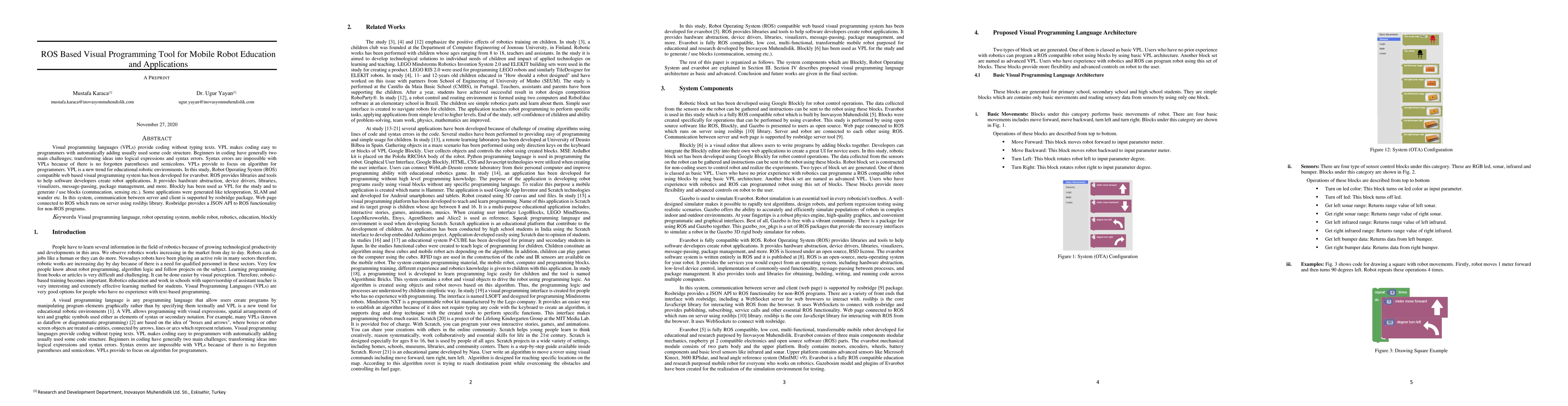 Visual programming languages (VPLs) provide coding without typing texts. VPL makes coding easy to programmers with automatically adding usually used some code structure. Beginners in coding have generally two main challenges; transforming ideas into logical expressions and syntax errors. Syntax errors are impossible with VPLs because of there is no forgotten parentheses and semicolons. VPLs provide to focus on algorithm for programmers. VPL is a new trend for educational robotic environments. In this study, Robot Operating System (ROS) compatible web based visual programming system has been developed for evarobot. ROS provides libraries and tools to help software developers create robot applications. It provides hardware abstraction, device drivers, libraries, visualizers, message-passing, package management, and more. Blockly has been used as VPL for the study and to generate / use blocks (commucation, sensing etc.). Some applications were generated like teleoperation, SLAM and wander etc. In this system, communication between server and client is supported by rosbridge package. Web page connected to ROS which runs on server using roslibjs library. Rosbridge provides a JSON API to ROS functionality for non-ROS programs.