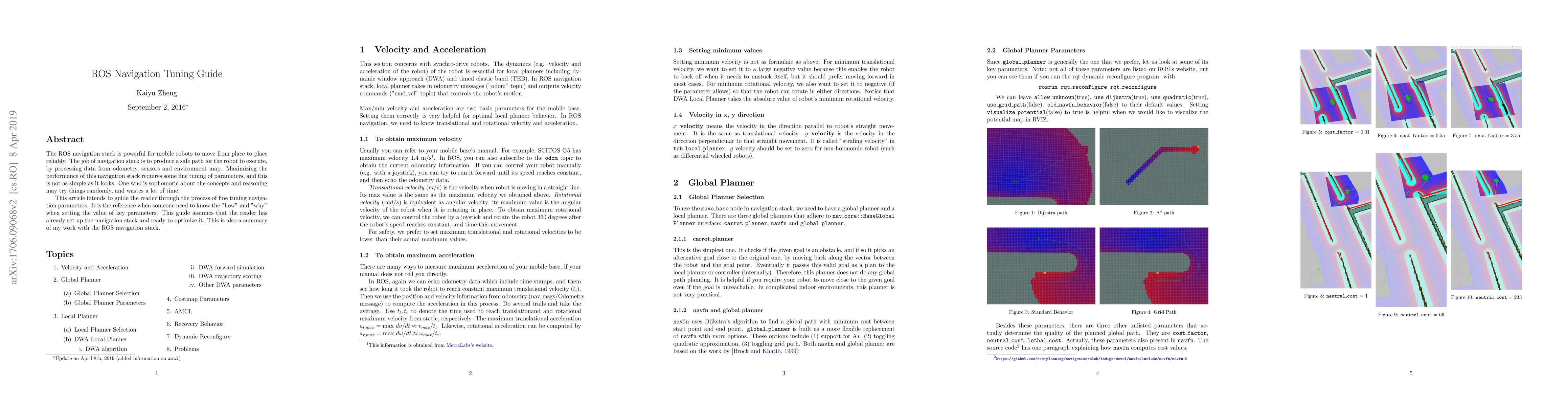 This paper provides a detailed guide for fine-tuning parameters in the ROS navigation stack to optimize mobile robot pathfinding. It explains the "how" and "why" behind setting key parameters, assuming prior setup of the navigation stack.