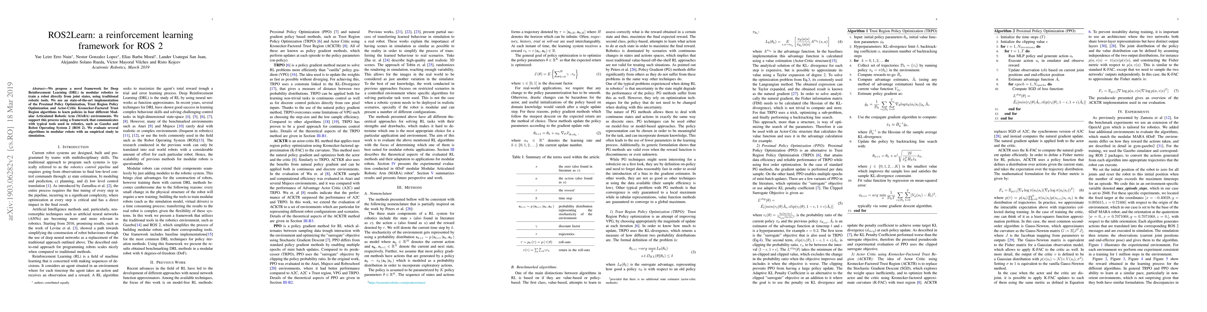 ROS2Learn is a reinforcement learning framework for ROS 2 that trains robots using advanced DRL algorithms like Proximal Policy Optimization, Trust Region Policy Optimization, and Actor-Critic. It integrates with tools like Gazebo and ROS 2, and evaluates its effectiveness in Modular Articulated Robotic Arm environments through simulation.