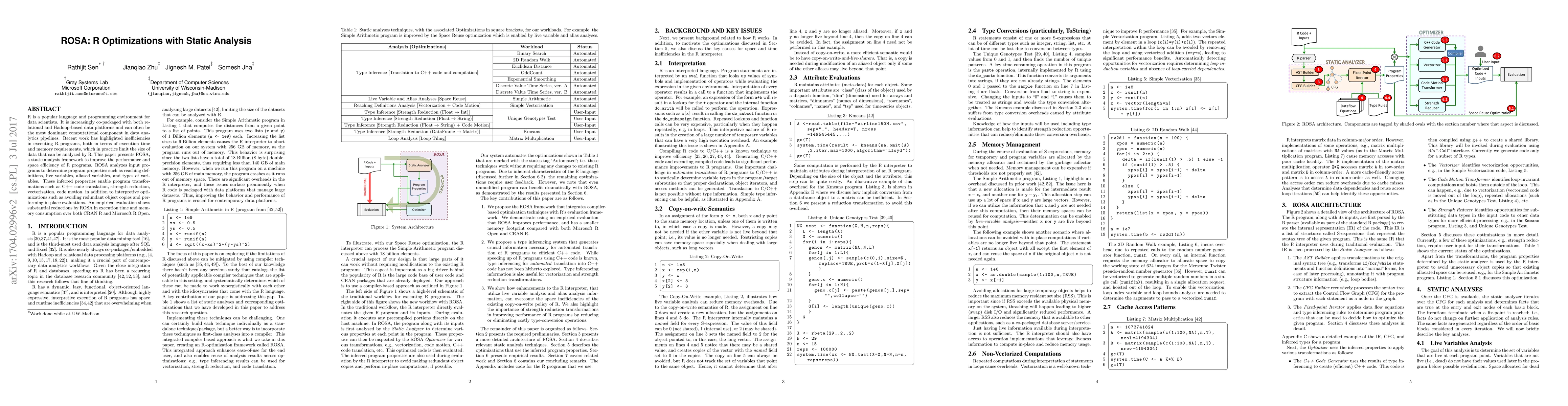 R is a popular language and programming environment for data scientists. It is increasingly co-packaged with both relational and Hadoop-based data platforms and can often be the most dominant computational component in data analytics pipelines. Recent work has highlighted inefficiencies in executing R programs, both in terms of execution time and memory requirements, which in practice limit the size of data that can be analyzed by R. This paper presents ROSA, a static analysis framework to improve the performance and space efficiency of R programs. ROSA analyzes input programs to determine program properties such as reaching definitions, live variables, aliased variables, and types of variables. These inferred properties enable program transformations such as C++ code translation, strength reduction, vectorization, code motion, in addition to interpretive optimizations such as avoiding redundant object copies and performing in-place evaluations. An empirical evaluation shows substantial reductions by ROSA in execution time and memory consumption over both CRAN R and Microsoft R Open.