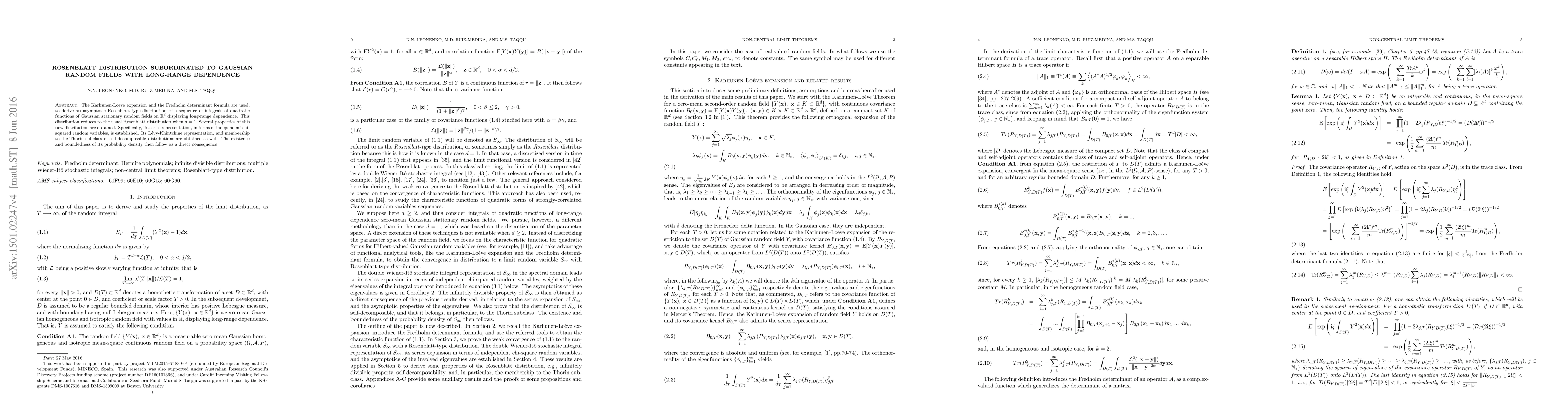 The Karhunen-Lo\`eve expansion and the Fredholm determinant formula are used to derive an asymptotic Rosenblatt-type distribution of a sequence of integrals of quadratic functions of Gaussian stationary random fields on R^d displaying long-range dependence. This distribution reduces to the usual Rosenblatt distribution when d=1. Several properties of this new distribution are obtained. Specifically, its series representation in terms of independent chi-squared random variables is given, the asymptotic behavior of the eigenvalues, its L\`evy-Khintchine representation, as well as its membership to the Thorin subclass of self-decomposable distributions. The existence and boundedness of its probability density is then a direct consequence.