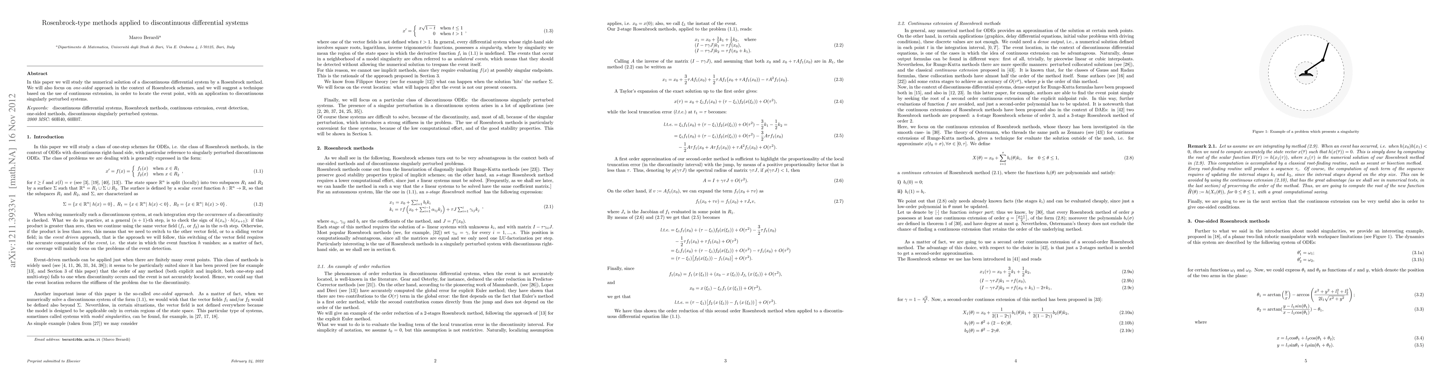 In this paper we will study the numerical solution of a discontinuous differential system by a Rosenbrock method. We will also focus on one-sided approach in the context of Rosenbrock schemes, and we will suggest a technique based on the use of continuous extension, in order to locate the event point, with an application to discontinuous singularly perturbed systems.