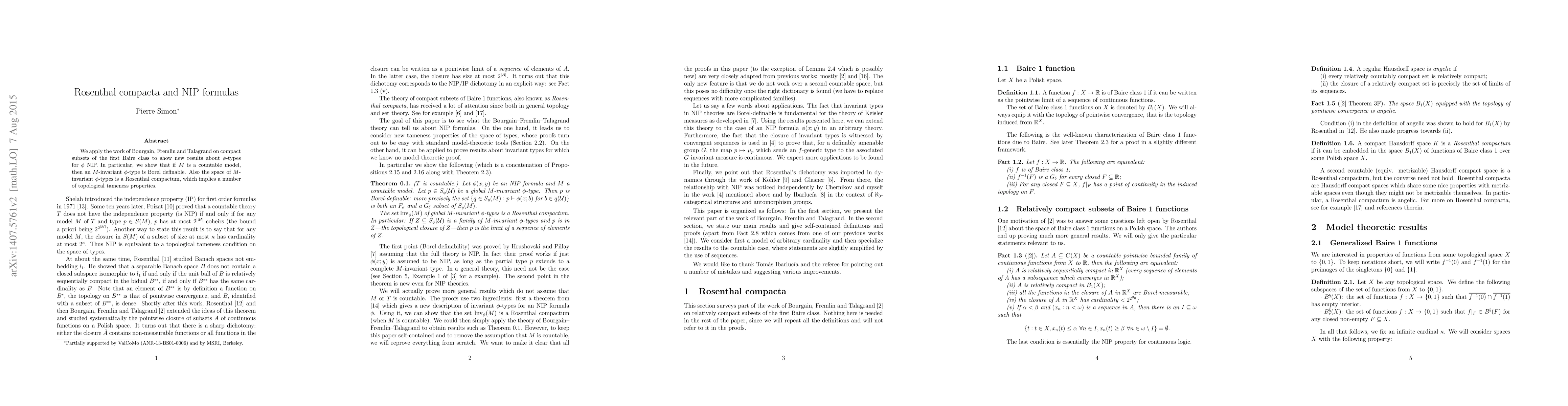 This paper applies results on compact subsets of the first Baire class to demonstrate that countable models of NIP formulas have Borel-definable M-invariant phi-types, and that the space of these types is a Rosenthal compactum, yielding topological tameness properties.