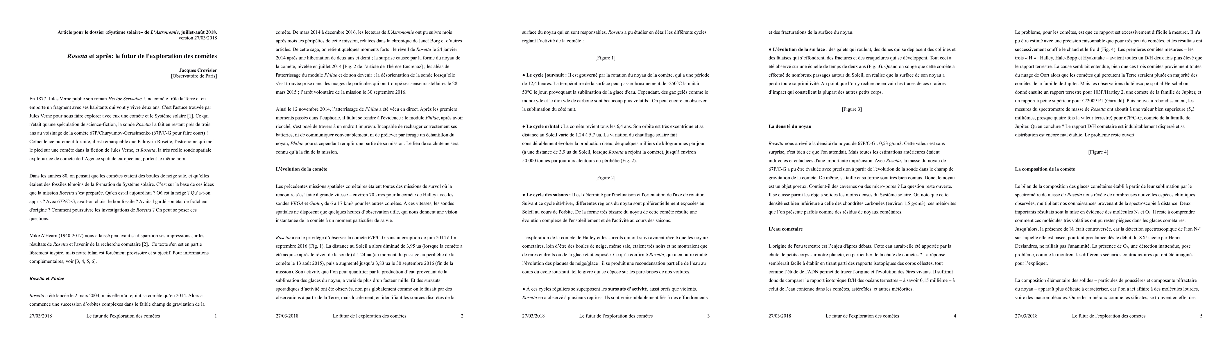 This article reviews the results obtained by the Rosetta space probe on comet 67P/Churyumov-Gerasimenko and the expectations of future space exploration of comets. -------------- Cet article pr\'esente une synth\`ese des r\'esultats obtenus par la sonde Rosetta sur la com\`ete 67P/Churyumov-Gerasimenko et envisage le futur de l'exploration spatiale des com\`etes.