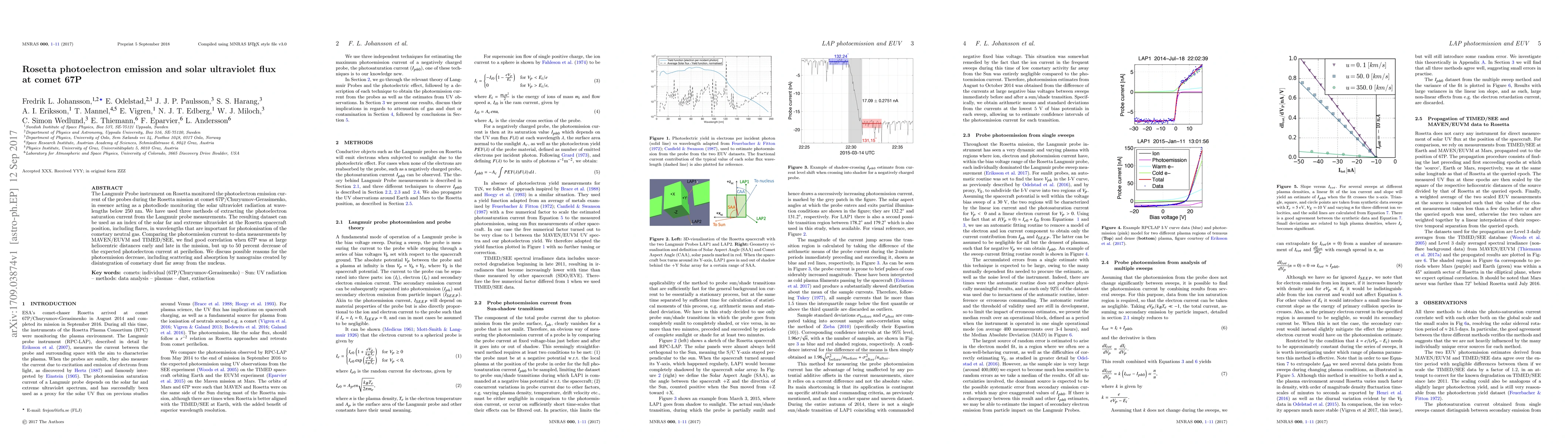 The Langmuir Probe instrument on Rosetta monitored the photoelectron emission cur- rent of the probes during the Rosetta mission at comet 67P/Churyumov-Gerasimenko, in essence acting as a photodiode monitoring the solar ultraviolet radiation at wave- lengths below 250 nm. We have used three methods of extracting the photoelectron saturation current from the Langmuir probe measurements. The resulting dataset can be used as an index of the solar far and extreme ultraviolet at the Rosetta spacecraft position, including flares, in wavelengths that are important for photoionisation of the cometary neutral gas. Comparing the photoemission current to data measurements by MAVEN/EUVM and TIMED/SEE, we find good correlation when 67P was at large heliocentric distances early and late in the mission, but up to 50 percent decrease of the expected photoelectron current at perihelion. We discuss possible reasons for the photoemission decrease, including scattering and absorption by nanograins created by disintegration of cometary dust far away from the nucleus.