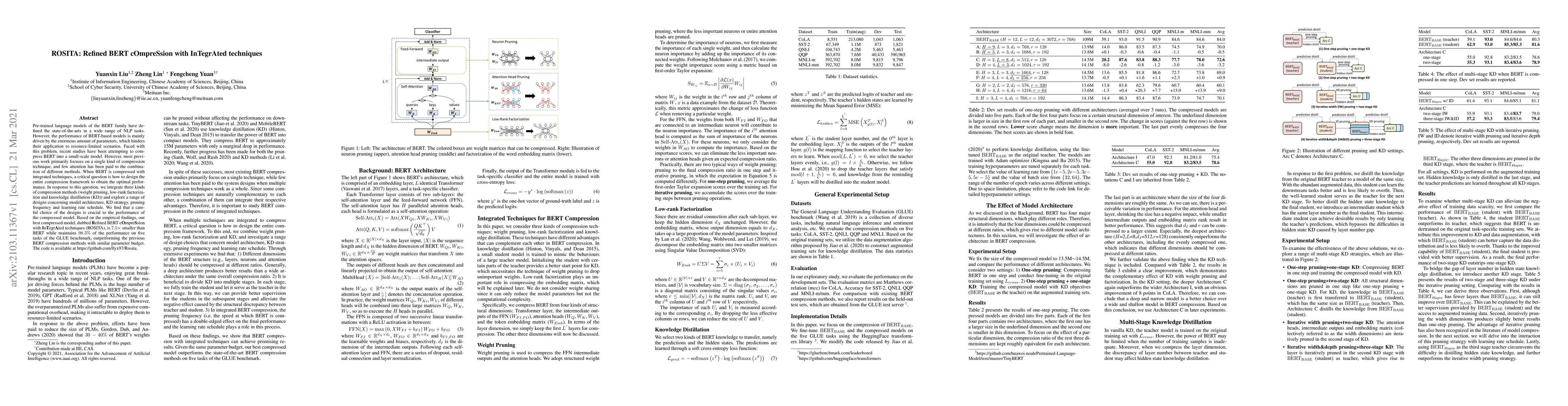 The paper presents ROSITA, a refined BERT compression method integrating weight pruning, low-rank factorization, and knowledge distillation to achieve optimal performance. ROSITA achieves a $7.5 \times$ reduction in size while maintaining $98.5\%$ of BERT's performance on GLUE tasks, outperforming previous methods.