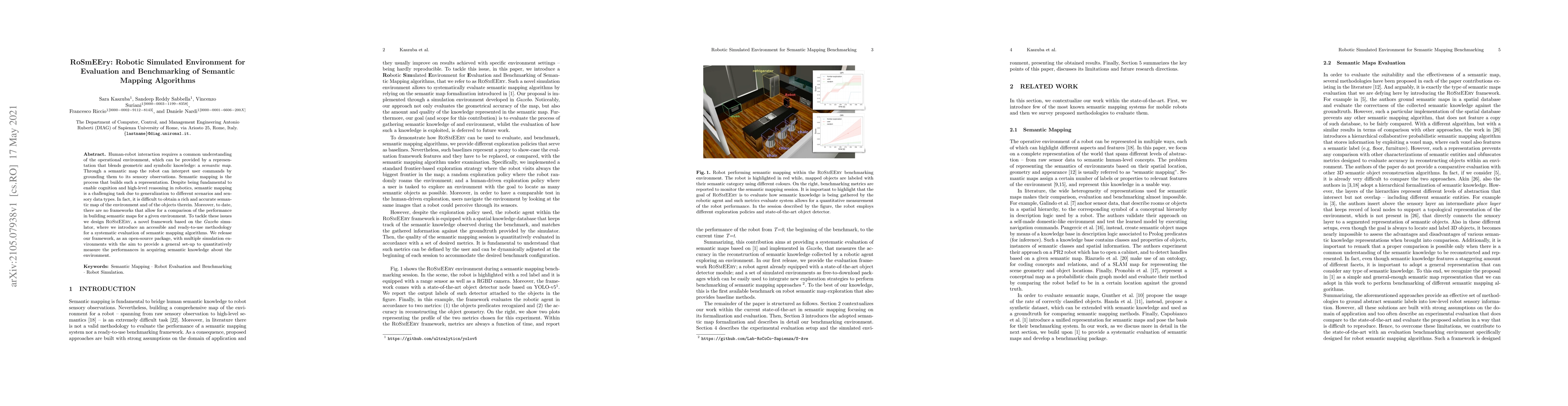 Human-robot interaction requires a common understanding of the operational environment, which can be provided by a representation that blends geometric and symbolic knowledge: a semantic map. Through a semantic map the robot can interpret user commands by grounding them to its sensory observations. Semantic mapping is the process that builds such a representation. Despite being fundamental to enable cognition and high-level reasoning in robotics, semantic mapping is a challenging task due to generalization to different scenarios and sensory data types. In fact, it is difficult to obtain a rich and accurate semantic map of the environment and of the objects therein. Moreover, to date, there are no frameworks that allow for a comparison of the performance in building semantic maps for a given environment. To tackle these issues we design RoSmEEry, a novel framework based on the Gazebo simulator, where we introduce an accessible and ready-to-use methodology for a systematic evaluation of semantic mapping algorithms. We release our framework, as an open-source package, with multiple simulation environments with the aim to provide a general set-up to quantitatively measure the performances in acquiring semantic knowledge about the environment.