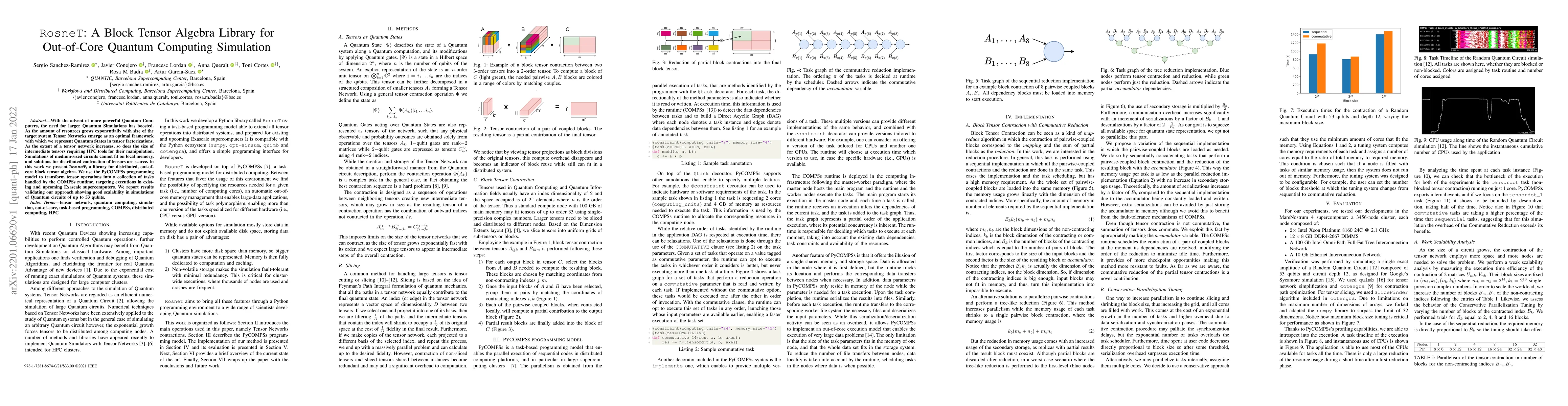 With the advent of more powerful Quantum Computers, the need for larger Quantum Simulations has boosted. As the amount of resources grows exponentially with size of the target system Tensor Networks emerge as an optimal framework with which we represent Quantum States in tensor factorizations. As the extent of a tensor network increases, so does the size of intermediate tensors requiring HPC tools for their manipulation. Simulations of medium-sized circuits cannot fit on local memory, and solutions for distributed contraction of tensors are scarce. In this work we present RosneT, a library for distributed, out-of-core block tensor algebra. We use the PyCOMPSs programming model to transform tensor operations into a collection of tasks handled by the COMPSs runtime, targeting executions in existing and upcoming Exascale supercomputers. We report results validating our approach showing good scalability in simulations of Quantum circuits of up to 53 qubits.