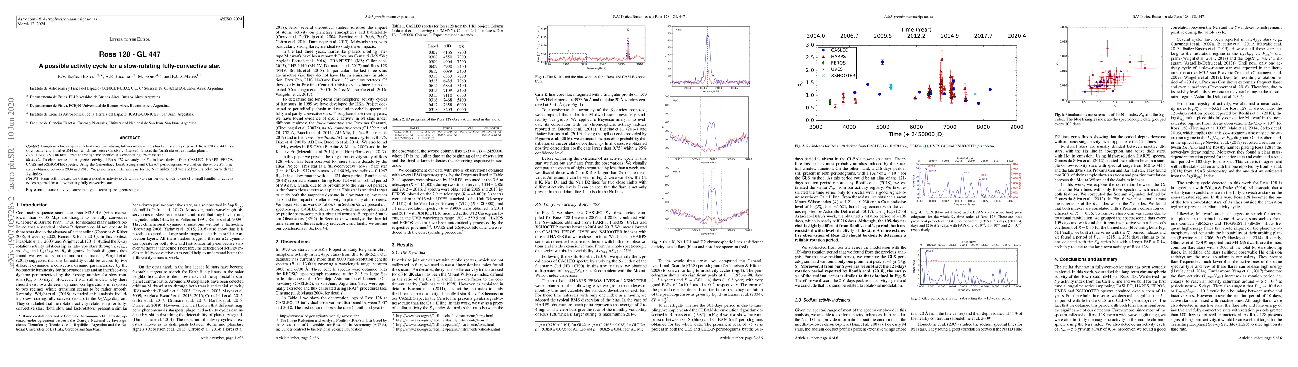 Context. Long-term chromospheric activity in slow-rotating fully-convective stars has been scarcely explored. Ross 128 (Gl 447) is a slow-rotator and inactive dM4 star which has been extensively observed. It hosts the fourth closest extrasolar planet. Aims. Ross 128 is an ideal target to test dynamo theories in slow-rotating low-mass star. Methods. To characterize the magnetic activity of Ross 128 we study the SK indexes derived from CASLEO, HARPS, FEROS, UVES and XSHOOTER spectra. Using the Generalized Lomb-Scargle and CLEAN periodograms, we analyze the whole SK time-series obtained between 2004 and 2018. We perform a similar analysis for the Na I index and we analyze its relation with the SK-index. Results. From both indexes, we obtain a possible activity cycle with a 5-year period, which is one of a small handful of activity cycles reported for a slow-rotating fully convective star.