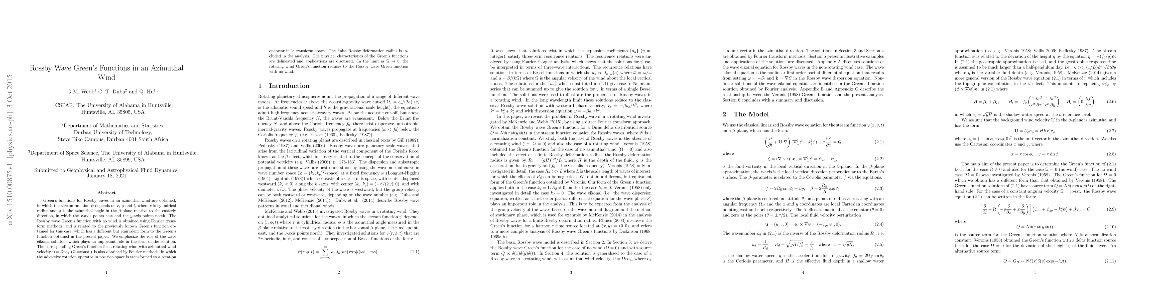 Green's functions for Rossby waves in an azimuthal wind are obtained, in which the stream-function $\psi$ depends on $r$, $\phi$ and $t$, where $r$ is cylindrical radius and $\phi$ is the azimuthal angle in the $\beta$-plane relative to the easterly direction, in which the $x$-axis points east and the $y$-axis points north. The Rossby wave Green's function with no wind is obtained using Fourier transform methods, and is related to the previously known Green's function obtained for this case, which has a different but equivalent form to the Green's function obtained in the present paper. We emphasize the role of the wave eikonal solution, which plays an important role in the form of the solution. The corresponding Green's function for a rotating wind with azimuthal wind velocity ${\bf u}=\Omega r{\bf e}_\phi$ ($\Omega=$const.) is also obtained by Fourier methods, in which the advective rotation operator in position space is transformed to a rotation operator in ${\bf k}$ transform space. The finite Rossby deformation radius is included in the analysis. The physical characteristics of the Green's functions are delineated and applications are discussed. In the limit as $\Omega\to 0$, the rotating wind Green's function reduces to the Rossby wave Green function with no wind.