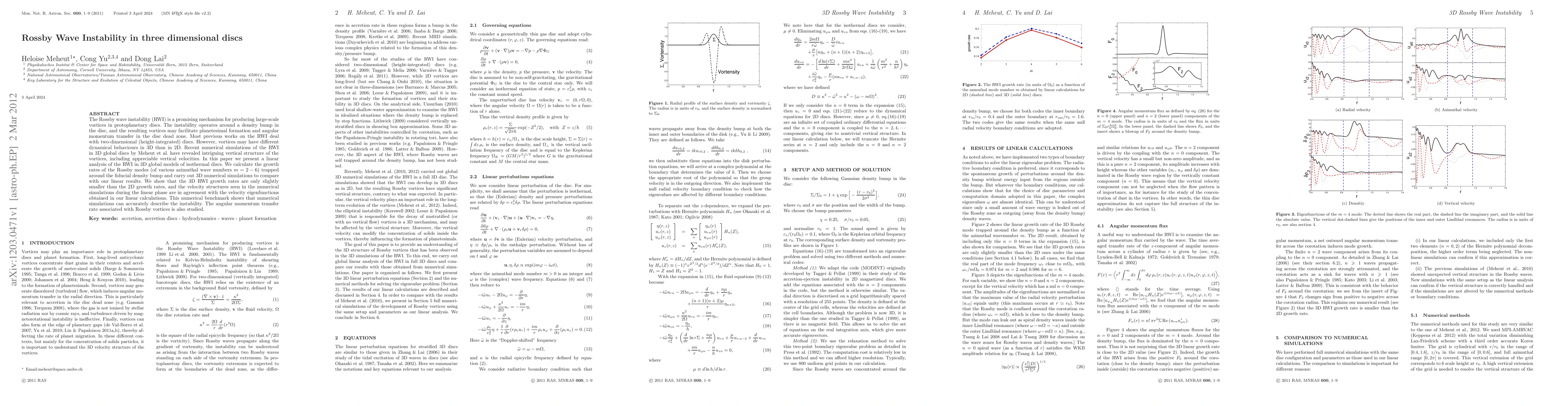 This paper investigates the Rossby wave instability (RWI) in three-dimensional protoplanetary discs, finding that 3D growth rates are only slightly lower than 2D rates. The study confirms that numerical simulations accurately depict the vertical dynamics of vortices, which may enhance planetesimal formation and angular momentum transfer in the disc.