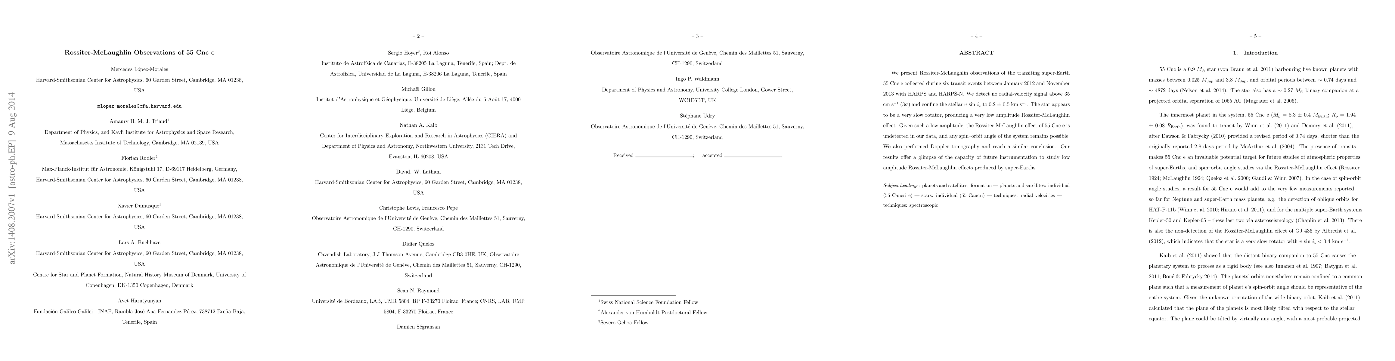 This study presents Rossiter-McLaughlin observations of the transiting super-Earth 55 Cnc e, revealing no detectable radial-velocity signal and a very low amplitude Rossiter-McLaughlin effect, indicating the star is a slow rotator and the planet's spin-orbit angle remains undetermined.