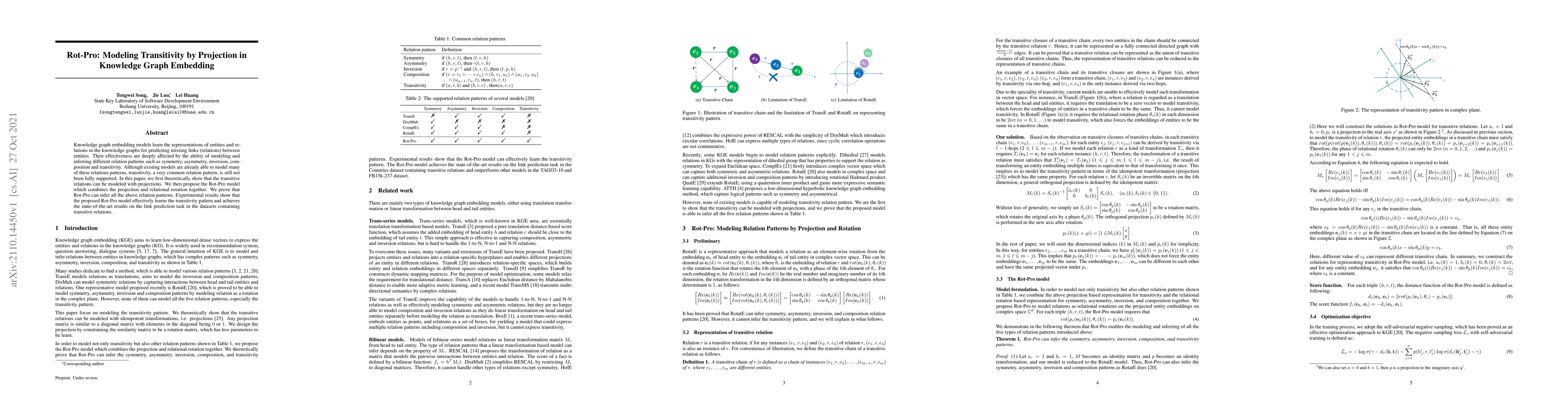 Knowledge graph embedding models learn the representations of entities and relations in the knowledge graphs for predicting missing links (relations) between entities. Their effectiveness are deeply affected by the ability of modeling and inferring different relation patterns such as symmetry, asymmetry, inversion, composition and transitivity. Although existing models are already able to model many of these relations patterns, transitivity, a very common relation pattern, is still not been fully supported. In this paper, we first theoretically show that the transitive relations can be modeled with projections. We then propose the Rot-Pro model which combines the projection and relational rotation together. We prove that Rot-Pro can infer all the above relation patterns. Experimental results show that the proposed Rot-Pro model effectively learns the transitivity pattern and achieves the state-of-the-art results on the link prediction task in the datasets containing transitive relations.